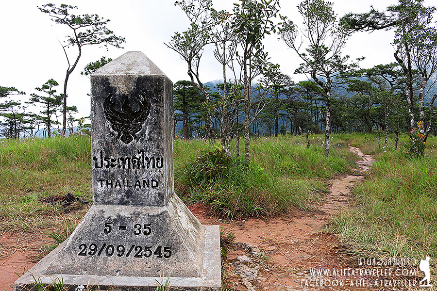 เดินไม่กี่ร้อยเมตรก็ถึงหลักหมุดไทย-ลาว มีภูเขาซึ่งเป็นยอดสูงสุดของภูสอยดาวเรียกกันว่าเนิน 2,100 เป็นฉากหลัง เรียกแบบนี้เพราะมีความสูงเหนือระดับน้ำทะเล 2,102 เมตร เป็นยอดสูงสุดอันดับสี่ของบ้านเรา สายหมอกกำลังคลอเคลียยอดเขาสวยงามมาก