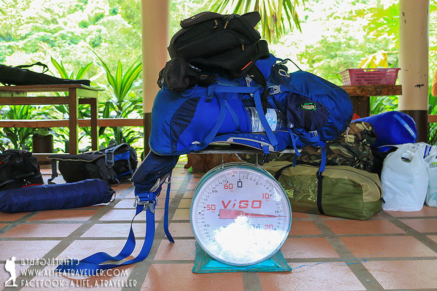 เอาล่ะ เตรียมตัวขึ้นภูกัน ขั้นแรกติดต่อจ่ายค่าธรรมเนียมค้างแรม ค่ามัดจำขยะ ค่ามัดจำบัตรรายการเช่าของที่ต้องใช้ด้านบน ต่อมาคือลูกหาบ ที่นี่คิดกิโลกรัมละ 30 บาท (อย่างน้อย 20 กิโลกรัม ซึ่งถ้ามาพร้อมกันหลายกลุ่มก็รวมกันไปได้) ตัวผมยังคงคอนเซ็ปต์เดิมคือแบกเองทั้งหมด ชั่งน้ำหนักได้เท่านี้ 16.2 กิโลกรัม