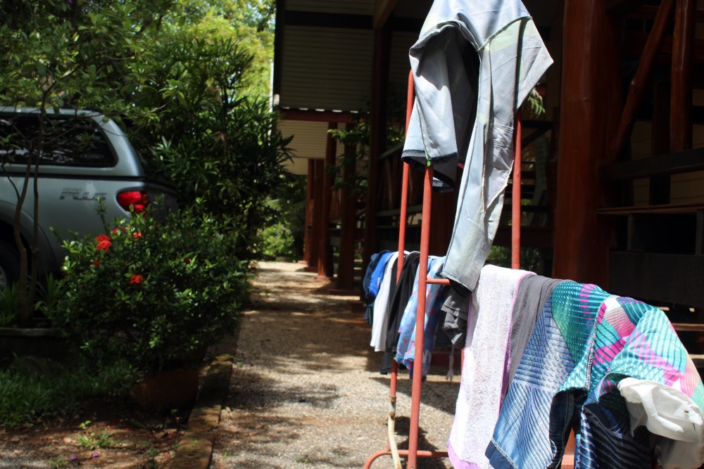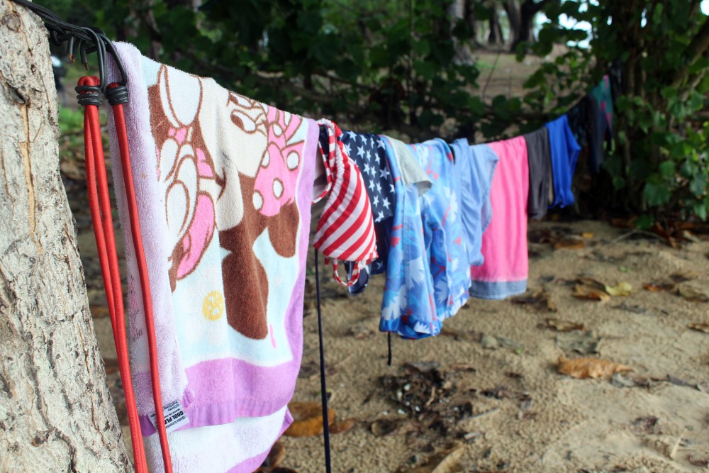 เสื้อผ้า เราจะซัก แล้วตากทุกที่ๆ พัก แต่ก็ไม่มีซักที่ ที่จะทำให้มันแห้งได้ ไม่มีแดดเลย ฝนตกซ้ำแล้วซ้ำอีก ..