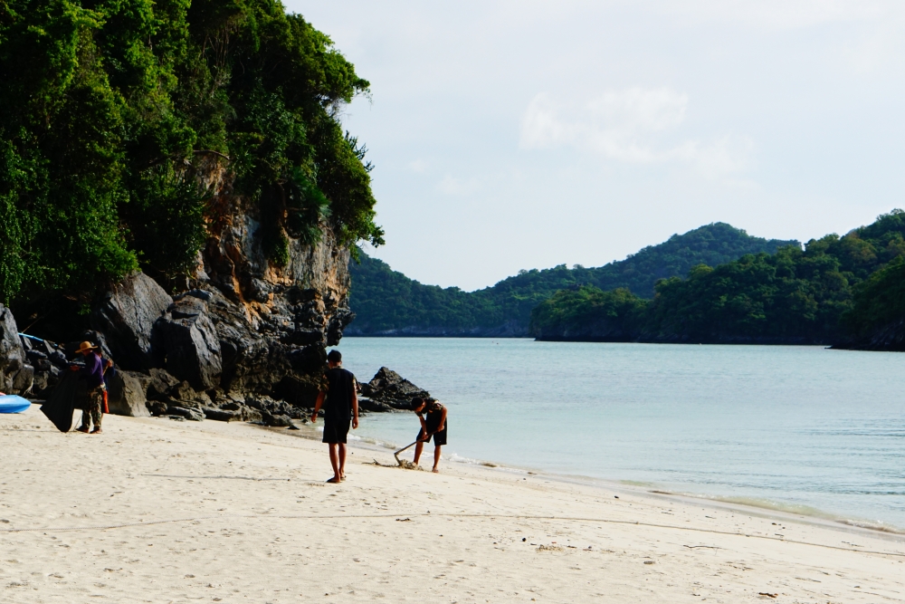 ถึงแล้วสมุย วันแห่งการผจญภัย ถึงเกาะปุ๊บก็เหมือนพายุก็ตั้งเค้า แต่ในความโชคร้ายก็ยังมีความโชคดีอยู่... พี่นพร เจ้าถิ่นสมุย เจ้าถิ่นในแง่ของความเก๋า เก๋าทั้งน้ำใจ ทั้งนิสัยใจคอ พี่แกคงเห็นอิสองตัวหน้าตาปะหลาดๆ ยืนงึกๆงักๆ เถียงกันอยู่นาน เลยเข้ามาถามด้วยความสงสารปนลำคาญเสียงแว้ดๆ "น้องจะไปไหนอ่ะ" ดั่งเสียงสวรรค์ ... พี่นพรได้พาเราไปหาเอเจ้นที่ไปหมู่เกาะอ่างทองที่เก๋าที่สุดในเกาะเช่นกัน นั่นก็คือ Samui Island Tour พี่แกบอกว่านี่อ่ะเป็นเจ้าแรกๆของเกาะ วางใจได้ ไม่มีชาร์จแน่นอน ซึ่งก็จริงเพราะเราได้ตั๋ว one day trip* ไปกลับหมู่เกาะอ่างทอง + อาหารกลางวัน ในราคา 900 บาท!!! อื้อหือออ คือมันดีอ่ะค่ะเป่าเปาา (*รายละเอียดโปรแกรม ไม่ใช่สำหรับดำน้ำดูปะการังใดๆ แต่เป็นทริปชมธรรมชาติทะเลใน ที่เกาะแม่เกาะ และจบที่เกาะวัวตาหลับแห่งหมู่เกาะอ่างทอง ส่วนถ้าใครจะพายเรือคายักจะจ่ายเพิ่มในราคา 1200 บาท ) เนื่องจากเราต้องการนอนพักที่อุทยานแห่งชาติหมู่เกาะอ่างทอง ซึ่งไม่มีเรือโดยตรง สมุย-อ่างทอง ทำให้เราต้องซื้อ One day trip ไปยังหมู่เกาะอ่างทอง ซึ่งขาไปก็ไปกับทัวร์ ขากลับก็กลับกับทัวร์เช่นเดิมในวันถัดมา ทุกอย่างดูเหมือนจะงดงามลงตัว แต่เรือมีเพียงรอบเดียว คือ 8.30 น. แต่เราไปถึงสมุยตอนนั้นก็12.45 น. แต่ไม่เป็นไร สองสาวผู้ไม่เคยวางแผน ก็ชินและชิวอยู่สมุยไปละกันล่ะคืนนี้ อิอิ 7.15 น. รถตู้ของบริษัททัวร์มารับตรงเวลาเป๊ะ รอบนี้เราทำเวลาได้ดี ไม่ตกรถค้า และได้ไปต่อค้า รถตู้ก็แวะรับนักท่องเที่ยวอีก 2-3 ที่ เต็มรถแล้วจึงมุ่งหน้าสู่ท่าเรือหน้าทอน เรือของบริษัทเป็นเรือใหญ่ค่ะ (ชาวต่างชาติบนเรือก็ so big เช่นกัน 55555) ถึงจะช้าหน่อยแต่ปลอดภัยชัวร์ อิอิ บนเรือมีกล้วย ครัวซองน้ำร้อนชากาแฟให้เบาๆ ตอนเช้าค่ะ ตามเคยค่ะ พอเรามาถึงนั่งปุ๊บยังไม่ทันที่ขุยผ้ากางเกงจะสัมผัสกับม้านั่ง เรือก็ติดเร่งเครื่องบรื้นทันที ถือว่าเรายังชนะในแคมเปญ เลทตลอดกาล อยู่ค่าา 55555 ใช้เวลาเดินทางประมาณ 2 ชั่วโมงครึ่ง มาถึงเกาะแม่เกาะ มีจุดชมวิวคือทะเลใน 1ใน3 ของประเทศเชียวนะเออ แต่ไม่ใช่สาระของเราไปต่อโล้ดด ในที่สุดเราก็มาถึงแล้ววว เกาะวัวตาหลับ ซึ่งเป็นหนึ่งในหมู่เกาะอ่างทอง เป็นที่ตั้งของอุทยานซึ่งเราจะพักกันเกาะนี้นั่นเองง พอมาถึงเราก็ไม่รีรอรีบไปติดต่อที่พัก เพราะว่าเมื่อวานเราเบี้ยวไม่ได้มา ซึ่งภาวนาเป็นอย่างยิ่งว่าจะมีบ้านว่างให้พิงพักตระหนักรู้ซักหลัง พอไปที่สำนักงานของอุทยาน ซึ่งพี่ที่นั่นบอกว่าบ้านทุกหลังถูกจองหมดแล้ว! โอ้แม่เจ้า ท่าจะได้นอนเตนท์จริงๆ ทั้งฝ