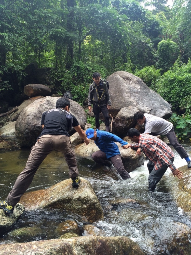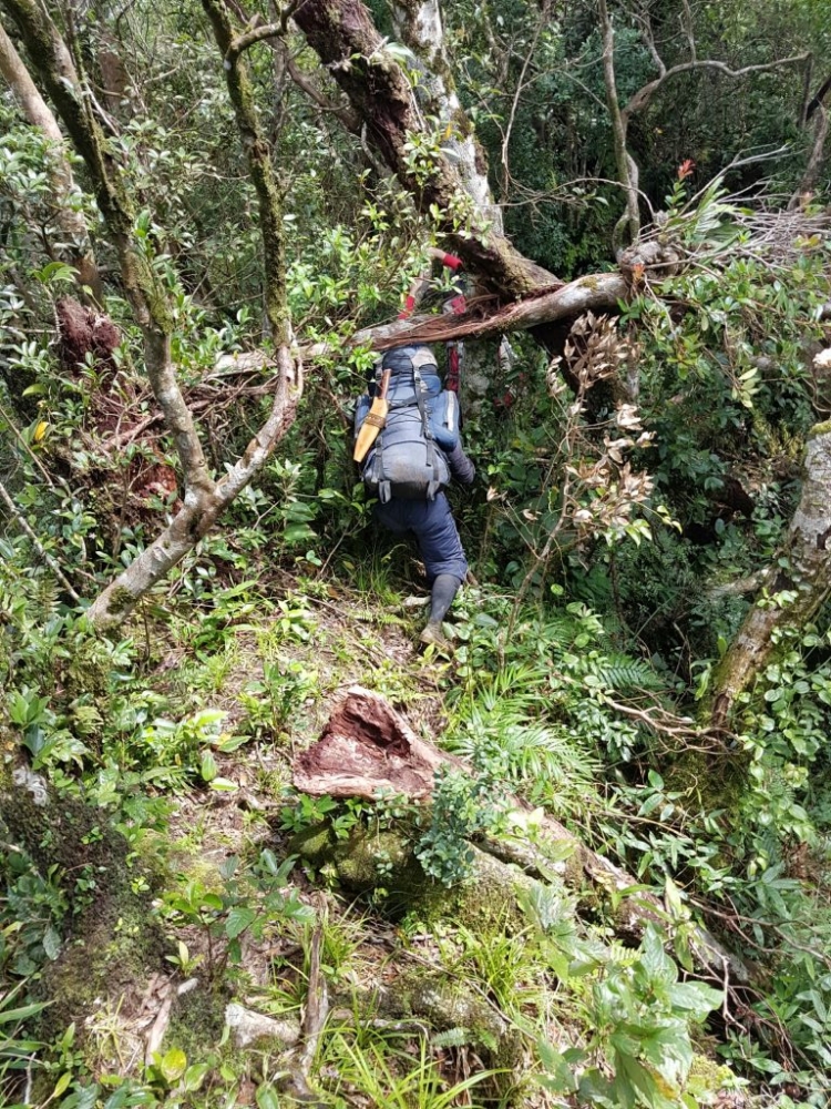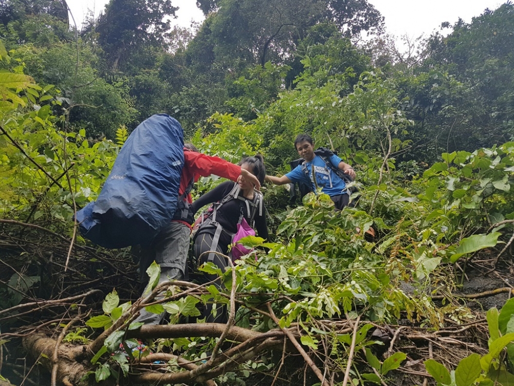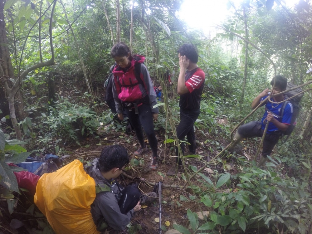 ยังคงเดินต่อขึ้นไปเรื่อยๆ ต้นไม้รกมากขึ้น ต้องมุด ก้มๆ งมๆ บางท่อนผมต้องนั่งยองๆ จนเกือบนอนราบเพื่อให้พ้นต้นไม้ และบางท่อน แม้จะเดินได้ แต่ทางก็แคบ มีต้นไม้มีหินให้หลบ ให้ปีนป่ายตลอดเวลา ผมนี่นึกว่ามาเจอด่านเข้าค่ายลูกเสือเลยนะครับ