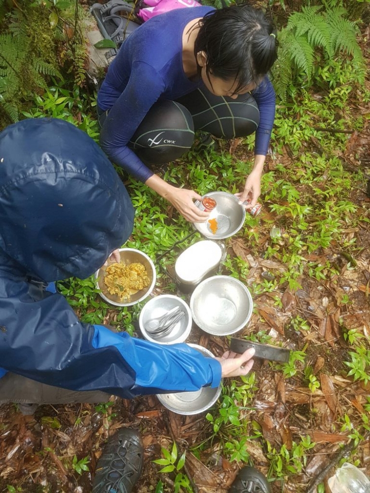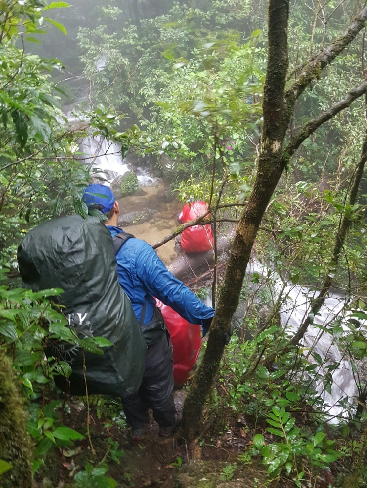 ช่วงที่เราตั้งแคมป์ ฝนยังคงตกอยู่ ฟลายชีทก็เก็บน้ำ เพราะไม่สามารถขึงตึงได้ กอปรกับพื้นเทลง ทำให้น้ำบางส่วนลงจากฟลายชีทไหลเข้ากราวชีท ตอนแรกๆก็ห่อกราวชีทขึ้นมาเป็นกำแพง แต่ก็เอาไม่อยู่ เพราะซึมทะลุมาได้ ผมเลยใช้วิธีขุดดินเป็นร่องน้ำ เพื่อให้ฝนไหลลงจากฟลายชีท ไหลไปลงหน้าผา แต่พอทำเสร็จ ฝนก็หยุดพอดี ไม่ได้ใช้บริการรางน้ำนายฟิวส์เลย ฮ่าๆ