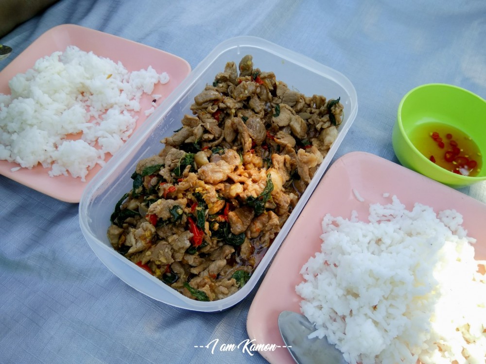 กะเพราสิ้นคิดแล้วก็ข้าวที่หุงจากบ้านเช่นกัน