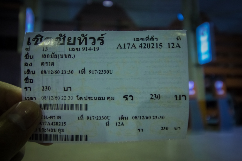มาเริ่มกันที่การเดินทางของเรากันเลย ตอนแรกกะว่าจะไปรถรอบเช้าแล้วไปขึ้นเรือรอบ 13.00 น. แต่ปรากฏว่าเรือรอบนี้เต็ม เลยต้องเปลี่ยนแผนใหม่ ทริปนี้ผมออกเดินทางโดยรถทัวร์ของเอกมัยเป็นรถของเชิดชัยทัวร์ในรอบดึก 23.30 น. ค่ารถ 230 บาท จะไปถึงตราดประมาณ เกือบๆตีห้า ที่หมอชิตก็มีเหมือนกันนะมีทั้งรถทัวร์ แล้วก็รถตู้รู้สึกว่ารอบเช้าสุดจะเป็นตีห้า
