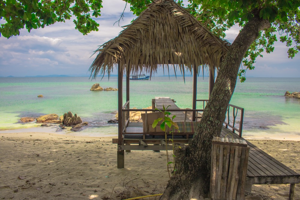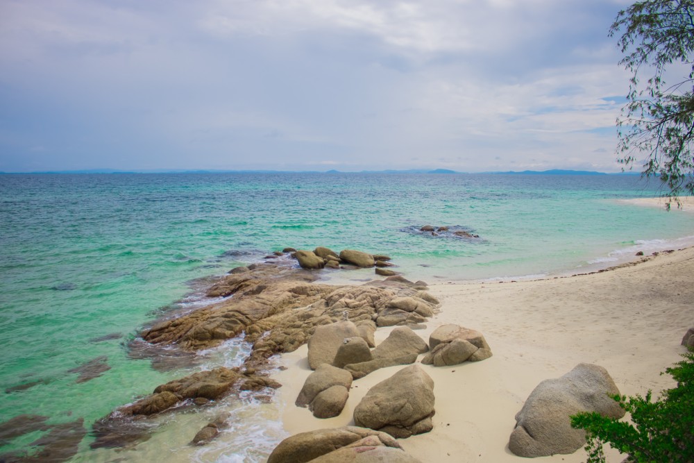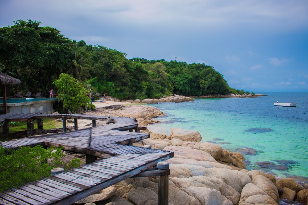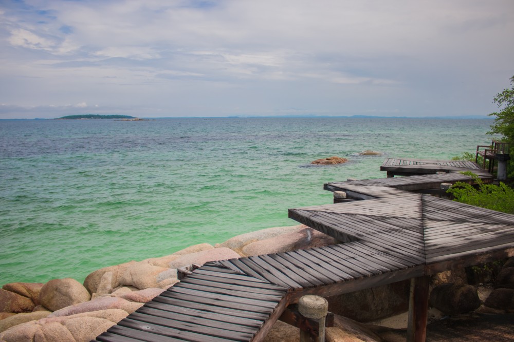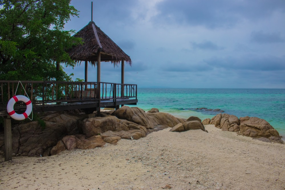 จากรูปทางด้านซ้ายของรูปจะเป็นโซนวิลล่าJ เป็นโซนติดทะเล เปิดประตูข้างหลังห้องพักไปสามารถลงทะเลได้เลย ส่วนด้านขวาจะเป็นโซนวิลล่าBซึ่งจะไม่ติดทะเลแต่ก็ไม่ได้อยู่ห่างทะเลมากนัก ราคาก็จะถูกกว่าโซน J นี่แหละฮะหน้าห้องของเรา เข้าไปดูภายในห้องกันดีกว่าว่าเป็นยังไงบ้าง นี่กุญแจห้องเรา เป็นงายย เตียงนอนของเรา นุ่มมาก นอนแล้วหลับปุ๋ยยย 555 คือแบบห้องกว้างมาก มีโซนที่เป็นเตียงนอน  โซนนั่งเล่นมีโซฟา ถึงแม้ภายในห้องอาจจะไม่มีทีวี ตู้เย็นแต่ว่าโดยรวมแล้ว ไม่มีก็ไม่จำเป็นเลย  ส่วนต่อมาจะเป็นส่วนของห้องแต่งตัว อ่างล้างหน้า มีแปรงสีฟัน ยาสีฟัน สบู่เหลวล้างมือ มีโลชั่นทาผิว ที่โกนหนวด มีที่เป่าผมสำหรับผู้หญิงด้วย มีอุปกรณ์ครบทุกอย่าง ห้องอาบน้ำ ส่วนห้องส้วมก็จะแยกเป็นอีกห้องนึง ส่วนด้านหลังเปิดประตูไป มีบันไดสามารถลงไปเล่นน้ำทะเลได้เลย ภาพทางด้านหลังก็จะประมาณนี้ครับ ส่วนที่ติดทะเลจะเป็นโซนวิลล่า J ทั้งหมด นี่ล่ะความฟินมันอยู่ตรงนี้ คือแบบเปิดประตูลงมาจากห้องเห็นทะเลเลย แล้วยังมีกระท่อมสะพานไม้ให้นั่งชิวๆอีกด้วย อยากจะเล่นน้ำตอนไหนก็ได้ มีความเป็นส่วนตัวแบบสุดๆ นี่ล่ะความฟินมันอยู่ตรงนี้ คือแบบเปิดประตูลงมาจากห้องเห็นทะเลเลย แล้วยังมีกระท่อมสะพานไม้ให้นั่งชิวๆอีกด้วย อยากจะเล่นน้ำตอนไหนก็ได้ มีความเป็นส่วนตัวแบบสุดๆ มีฝูงปลาน้อยด้วย นี่ไงเจ้าเจอเจ้าถิ่นแล้วนกยูง มันรำแพนให้ดูด้วย เก็บกระเป๋าไว้ห้องเสร็จ เรามาสำรวจรอบเกาะกันดีกว่าว่ามีอะไรบ้าง หาดตรงนี้เป็นส่วนตัวมาก อยู่ท้ายสุดเลย มีห้องพักด้วยไม่แน่ใจว่าเป็นโซนอะไร เห็นมีคนพักอยู่เลยไม่ได้ถ่ายรูปมา เดินเรื่อยๆ มาสดุดตาให้หินที่อยู่ในทะเลก้อนนี้แหละ เอ๊ะมันเหมือนอะไรหว่า 555 ลองจิตนาการดูว่ามันเหมือนอะไร อยากลองถ่ายแบบอาร์ตๆดู กุญแจเกือบไปกะน้ำเพราะรูปนี้แหละ 5555 ป่ะเดินป่ากันต่อ เพิ่งเดินมาได้นิดเดียวเอง ลุยยยย เดินตามทาง ตามลูกศรไปเรื่อยๆ ด้านหลังของเกาะแทบจะไม่มีหาดทรายเลย ส่วนใหญ่จะมีแต่กองหิน มองดูก็สวยไปอีกแบบ เกาะนี้สามารถตกปลาได้นะครับ ใครจะพกเบ็ดมาก็ได้ตามสบายเลยครับ ผมว่าเกาะนี้ยังสมบูรณ์อยู่พอสมควรเลยมีทั้งต้นไม้ใหญ่ ต้นไม้ป่า พืชพรรณธรรมชาติอีกมากมาย ผมเกาะนี้หินรูปร่างแปลกๆเยอะนะ ดูคลาสสิคไปอีกแบบ ลานหินตรงนี้มีชื่อด้วยนะ เป็นลานหินขนมปังกับกองหินโขลงช้าง นี่ไงมีป้ายชื่อบอกด้วย ส่วนใหญ่หาดด้านหลังจะเป็นหิน หินรูปร่างแปลกๆเยอะมาก ภาพระหว่างทาง มีดอกไม้ด้วยหรือดอกหญ้ากฌไม่รู้ 555 มองดูต้นไม
