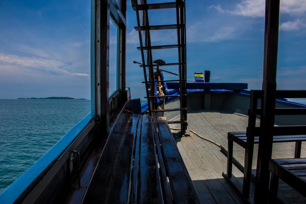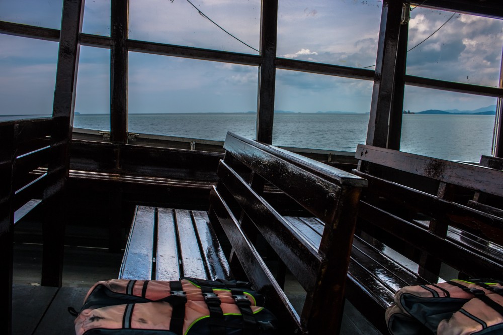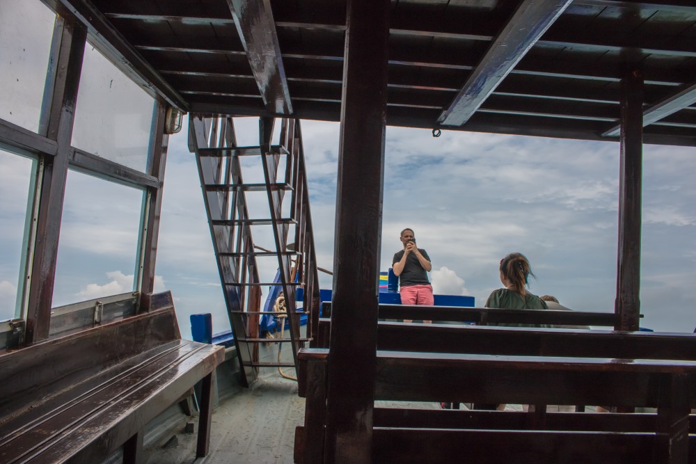 วันนี้เรือออกเร็วยังไม่ถึงบ่ายโมงเรือก็ออกเลย เพราะวันนี้มีคนเข้าพักไม่กี่ห้อง เรือมีแค่รอบเดียวเท่านั้นนะครับ 13.00 น.คือถ้ามาต้องเผื่อเวลาให้ดีครับ ถ้าจะนั่งรถตู้จากอนุเสารีย์รอบสุดท้ายไม่ควรเกินรอบ 09.00 น.นะครับเพราะถ้ามาไม่ทันเรือจะไม่รอนะครับ ต้องเหมาเรือสปีดโบ๊ดไปราคาหลายบาทอยู่ครับ  ดูภายในเรือคิดดูถ่ายรูปหลบคนได้อ่ะ 555 เสมือนทั้งลำมีเพียงแค่เรา ว้าวเห็นเกาะมันนอกแว้ว