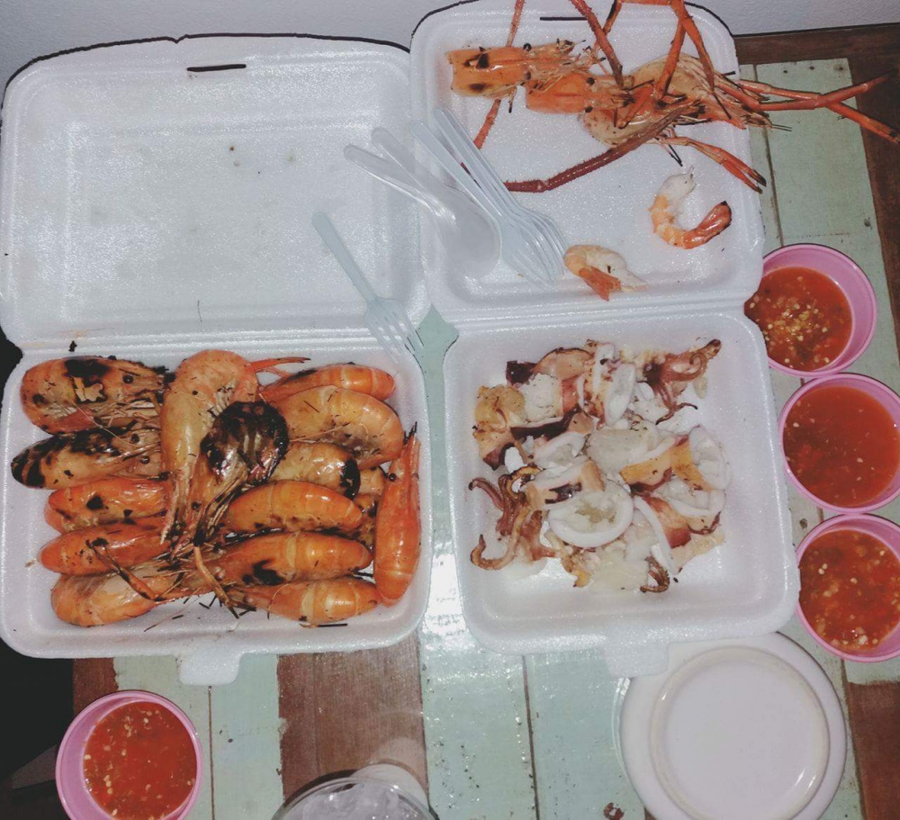 ร้านขายอาหารทะเลจะอยู่ริมทางตลอดแนว เลือกซื้อร้านไหนก็ได้ เค้าจะย่างให้เราและมีน้ำจิ้มรสเด็ด มาให้ด้วย