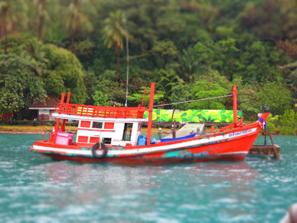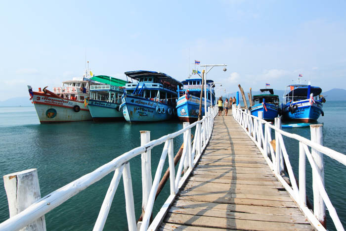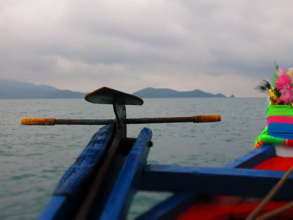 ก้าวเท้าเหยียบกาบเรือหาที่นั่งกันตามสบาย ราคาเรือธรรมดาคนละ300 บาท  มีบริการวันละหนึ่งเที่ยวเท่านั้น  มุ่งหน้าสู่ท่าเรือแหลมงอบ(ท่าเรือกรมหลวงชุมพร)  นั่งชมวิวสองข้างทางผ่านทิวแถวเกาะง่าม ซึ่งเป็นเกาะสองเกาะถูกเชื่อมไว้ด้วยหาดทรายขาว  ผ่านเกาะช้างที่ใหญ่โตเขียวเข้มสะดุดตา สายลมพัดพาละอองฝนมาประพรมลงตามเนื้อตัว  นั่งเพลินจนเผลอหลับไปด้วยอากาศเย็นกายสบายตัว