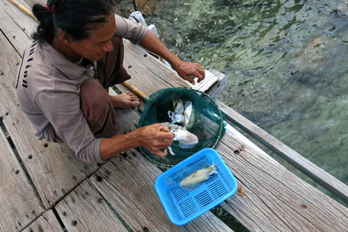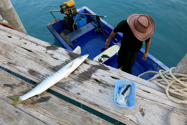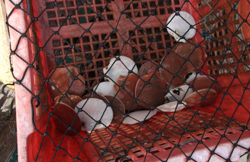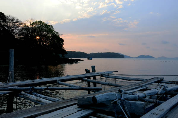 หลังจากทอดน่องแถวชายหาด และสะพานเทียบเรือ บริเวณกระท่อมยายมา ได้สักพัก ท้องฟ้าก็เริ่มย่างเข้าสู่ความมืด สีน้ำเงินเข้มเริ่มเคลือบลงบนผืนฟ้า แสงเหลืองนวลของพระอาทิตย์เริ่มจากหาย มาพร้อมกับเสียงท้องร้องว่าได้เวลาอาหารเย็นแล้วซิ ...เลยขอฝากท้องไว้กับกระท่อมยายมาซะเลย  ระหว่างรอคุณลุงผู้ดูแลที่นี้ก็ชี้ชวนให้ชื่นชมกับปลาเก๋าตัวยักษ์ที่อยู่ในกระชังด้านล่าง แถมยังมีประหมึกสดๆที่เพิ่งตกมา หืมม..แล้วก็พึงให้สงสาร  แต่ทีเด็ดที่คุณลุงนำเสนอ แน่นิ่งอยู่ตะกร้าด้านล่าง นั่นคือหอยเชลล์  ฝาหอยใหญ่กว่าฝ่ามือ สีน้ำตาลอ่อนเจือชมพูนิดๆ นอนนิ่งอยู่ในน้ำ เลยสงสัยว่าหอยเชลล์นี้มันว่ายน้ำยังไงเกิดมาไม่เคยเห็น...คุณลุงแกเลยหยิบเชือกสาวตะกร้าขึ้นจากน้ำแล้วโยนลงไป นั้นไงหอยว่ายน้ำ...ฮ่าๆๆ   หอยเชลล์พากันอ้าฝาหอยดัง “กับๆๆ”  ตัวของมันก็ลอยอ้าปากอยู่ผิวน้ำ   แต่ถ้ามันไม่ได้อยู่ในตะกร้า มันคงว่ายน้ำไปไกลแล้วว...เราก็อดกิน!