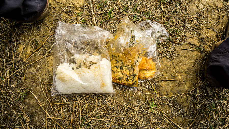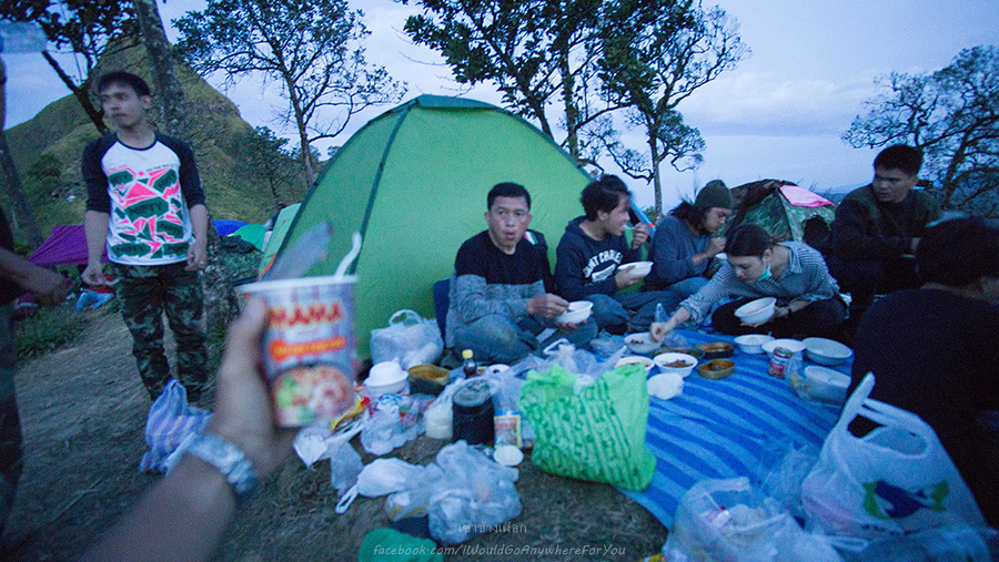 ถึงจุดกางเต๊นท์ก็กินอาหารเย็นกันครับ ผมไปขอนํ้าร้อนจากกลุ่มลูกหาบมาต้มมาม่าคัพ