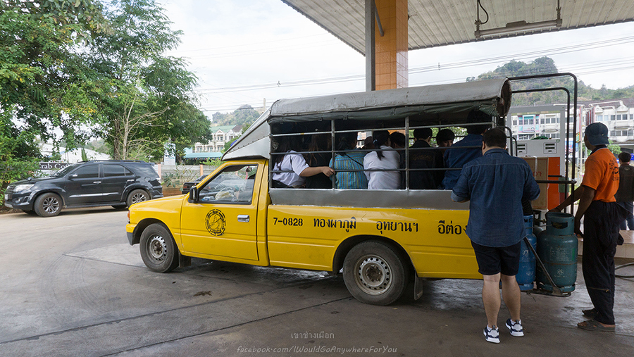 ตอนรถสองแถวออกออก รถได้วิ่งย้อนกลับไปทางแยกที่ไปสังขละบุรี ผมก็งงว่าวิ่งย้อนกลับไปทำไม แต่ก็คิดขึ้นมาได้ว่า หลังจากตัวเมืองทองผาภูมิไปจนถึงบ้านอีต่องและอุทยานแห่งชาติทองผาภูมิ จะไม่มีปั๊มนํ้ามันแล้วครับ ปั๊มสุดท้ายคือปั๊ม ปตท. ก่อนจะถึง 3 แยก ที่ไปทองผาภูมิหรือสังขละบุรี