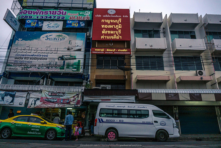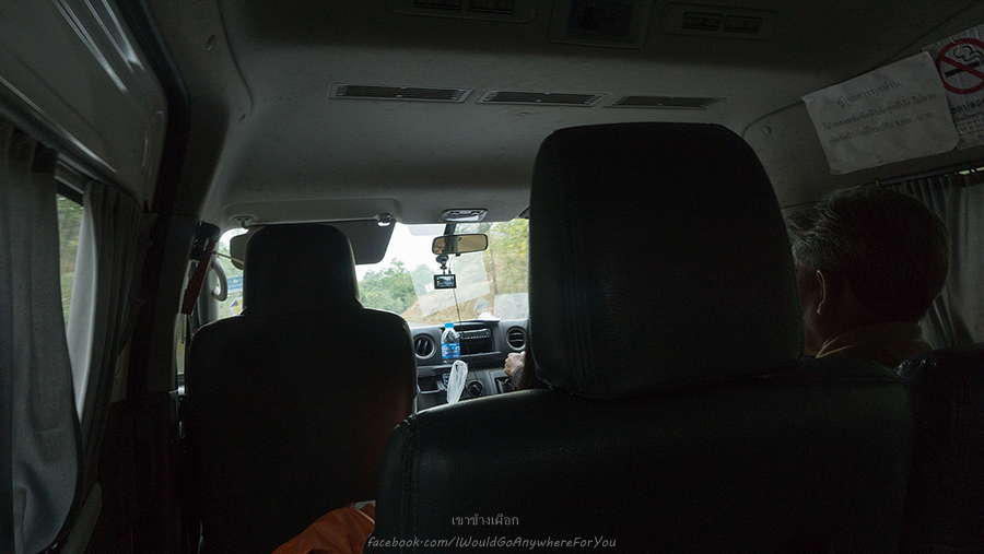 พอถึง บขส.กาญจนบุรี ต้องเดินทางต่อไปที่ตัวอำเภอทองผาภูมิ มีให้เลือกทั้งรถบัสประจำทางหวานเย็น ราคา 80 บาท และรถตู้ ผมเลือกรถตู้ของบริษัท เอเชียไทรโยค ราคา 110 บาท โดยรถเต็มเมื่อไรก็ออกครับ โดยคันของผมออกเวลาประมาณ 7.30 ถึงอำเภอทองผาภูมิ 9.00 น. ตอนรอขึ้นรถแวะซื้อของกินใน 7-11 กับหมูปิ้งกินรวมกันแล้ว 50 บาท นํ้าเปล่าขวดใหญ่ 14 บาท