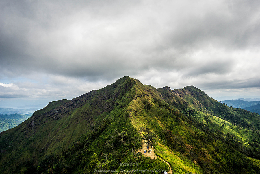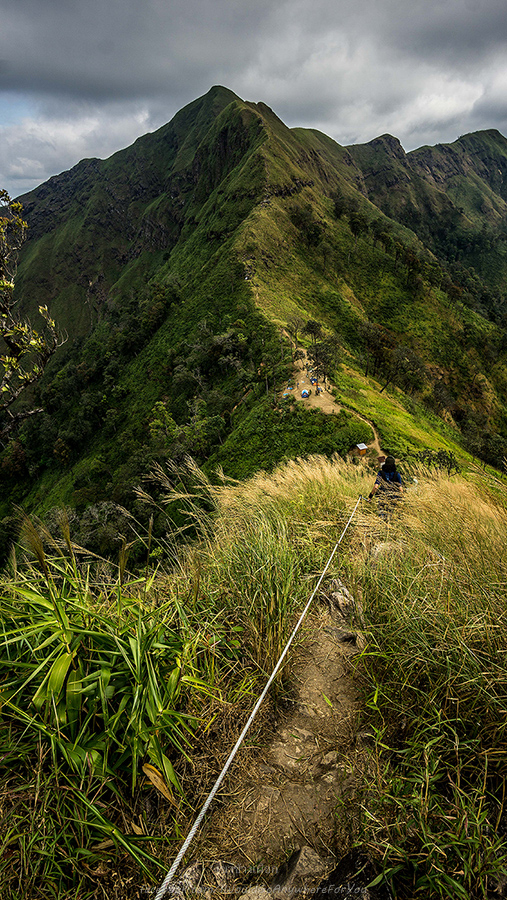 จุดกางเต๊นท์คือจุดที่เว้าลงไปตํ่าสุด ฝั่งด้านซ้ายในภาพ สันคมมีดคือจุดที่เป็นหยักๆ บริเวณกลางภาพ ส่วนยอดสูงสุดเขาช้างเผือกอยู่ทางขวามือที่มีทางเดินขึ้นไป