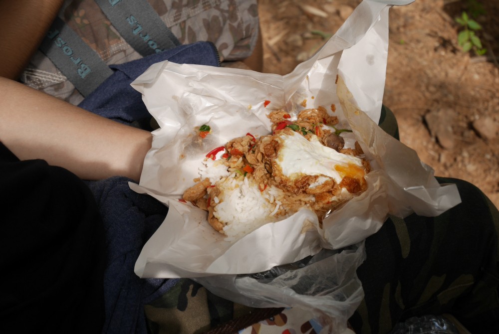 สั่งข้าวกระเพราไข่ดาวคนละ 1 ห่อ จากร้านสวัสดิการด้านล่างพกติดตัวไปกินระหว่างทาง