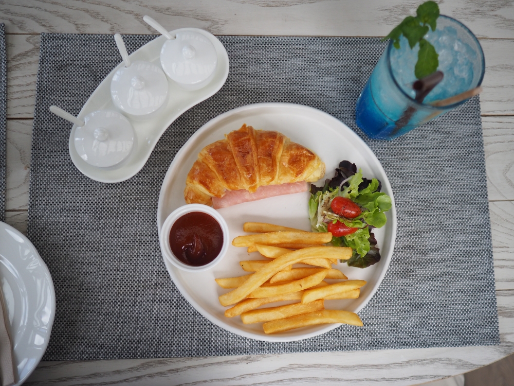 อันนี้เป็นภาพบรรยากาศโดยรอบของที่นี่นะครับ ตึกที่เห็นเป็นโซนของร้านอาหารนะครับ ส่วนด้านนี้เป็นโซนของหวานนะครับ      เรามาต่อกันที่อาหารกับเครื่องดื่มดีกว่าครับ ที่ผมสั่งมาอันนี้น่าจะเป็น ครัวซองค์แฮมชีสครับ วันที่ไปทางร้านจัด Promotion ซื้อเครื่องดื่ม 1 แก้ว แถมฟรีอีก 1 แก้วครับ โดยทางร้านจะมีรายการให้เลือก ส่วนผมสั่งเป็น Blue lemon Soda (อันนี้ผมก็ไม่แน่ใจเหมือนกันนะครับว่าชื่อที่ผมเรียกถูกไหม ต้องขออภัยด้วยนะครับ) อีกแก้วเป็น Lemon Soda ของแฟนผมครับ รสชาติของอาหารอร่อยดีนะครับ ถ้าได้มาเขาใหญ่ อย่าลืมแวะมาที่นี่เชียว