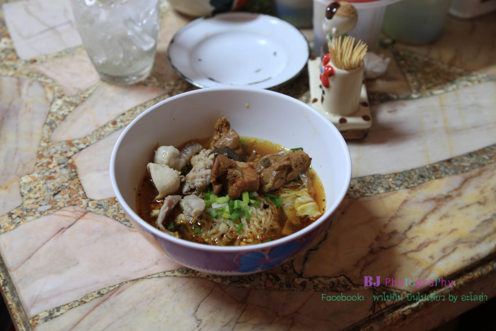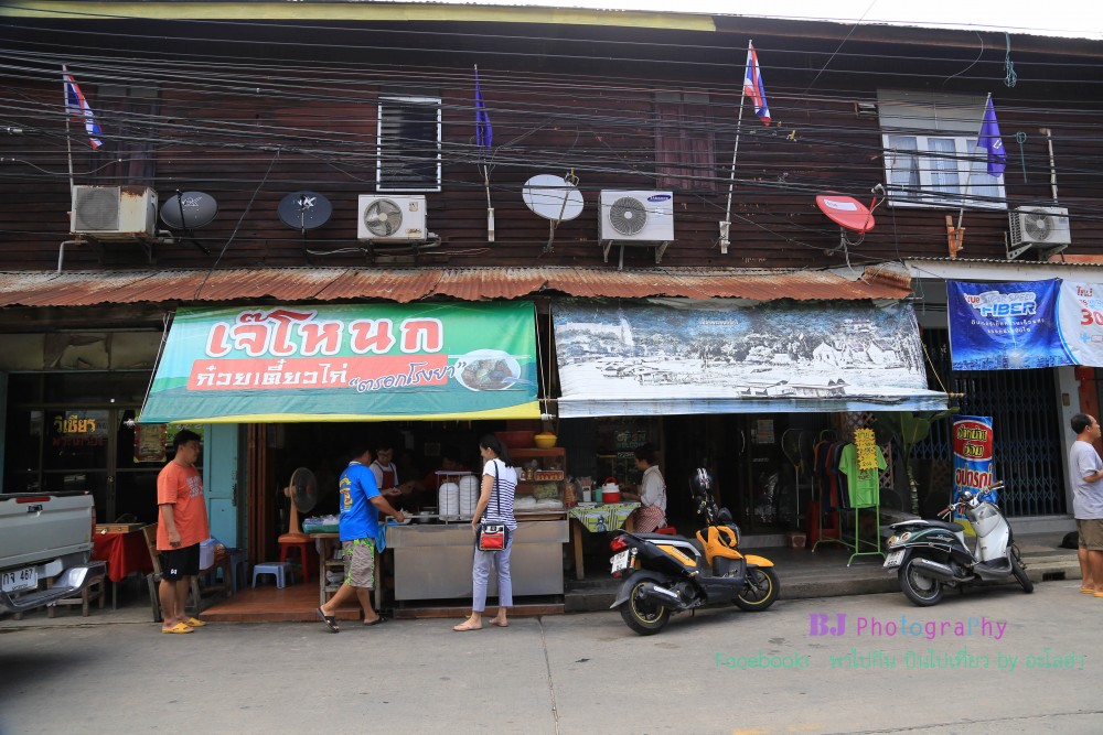 ร้านแรกเป็นก๋วยเตี๋ยวไก่เจ๊โหนก ที่ติดใจต้องมาซ้ำอีกหลายรอบ ร้านเริ่มขายประมาณเก้าโมงเช้า ขายจนถึงบ่ายๆหรือจนกว่าก๋วยเตี๋ยวจะหมด บางวันก็หมดเร็วเพราะมีคนมาเหมาไปทำบุญบ้าง เหมาไปเลี้ยงบ้าง มีทั้งไก่ตุ๋น หมูตุ๋น หมูเด้ง มีพริกเผาเข้มข้นราดด้วย เส้นบะหมี่อร่อยเหนียวนุ่ม อร่อยทั้งแบบน้ำแบบแห้ง