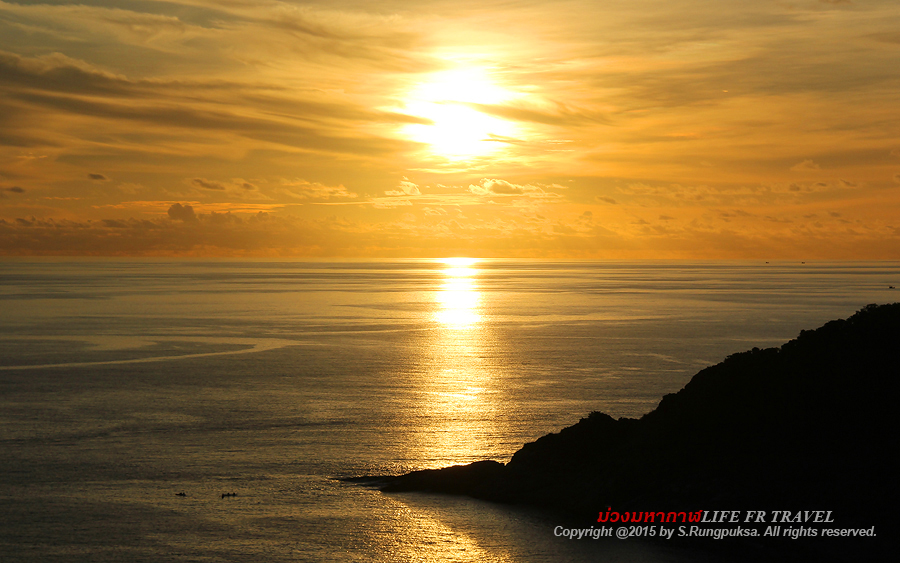 ยามเย็นที่แหลมพรมเทพ ดวงตะวันสาดส่องแสงสีทองกระทบผืนน้ำในช่วงเวลาแสงสุดท้ายของวัน