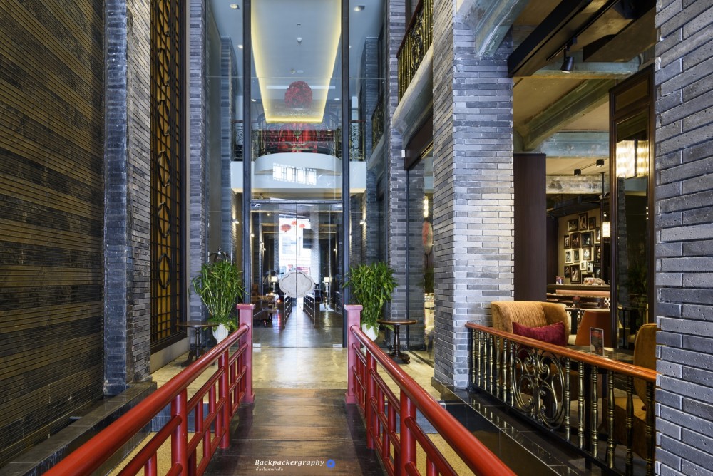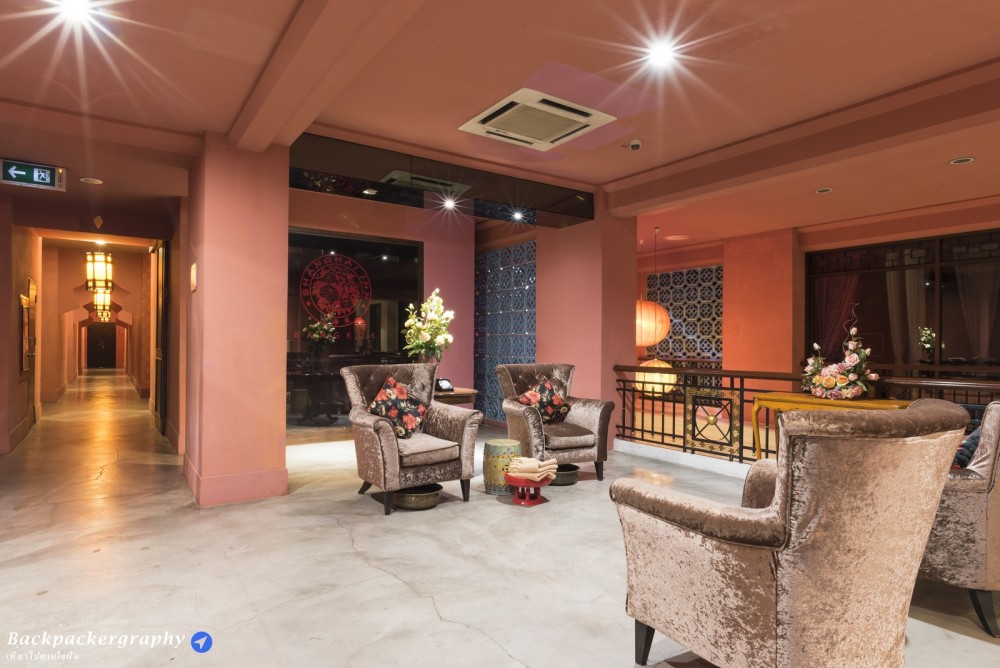 ทางเข้าโรงแรม ตกแต่งสวยงาม ทำเป็นสะพานไม้สีแดงแบบจีนให้เราเดินข้ามเข้าไปยัง Lobby ของโรงแรม ชั้น1จะเป็น Lobby และ Bar ของโรงแรม หัวค่ำจะมีวงดนตรีมาเล่นเพลงพร้อมกับนั่งชมบรรยายกาศของ China Town ก็ชิลไปอีกแบบ