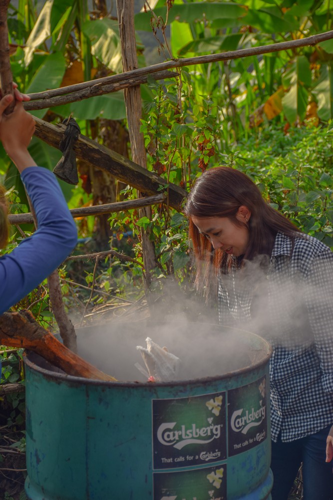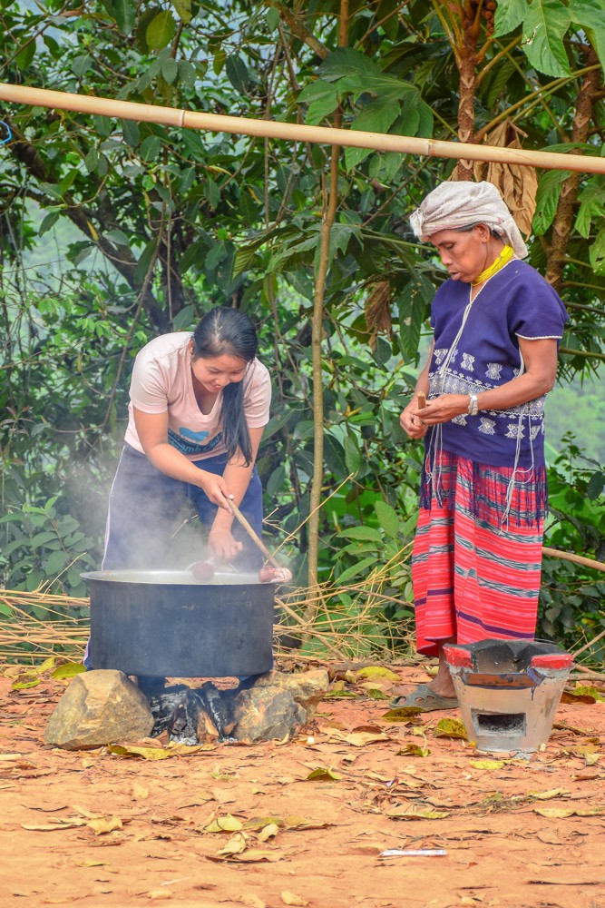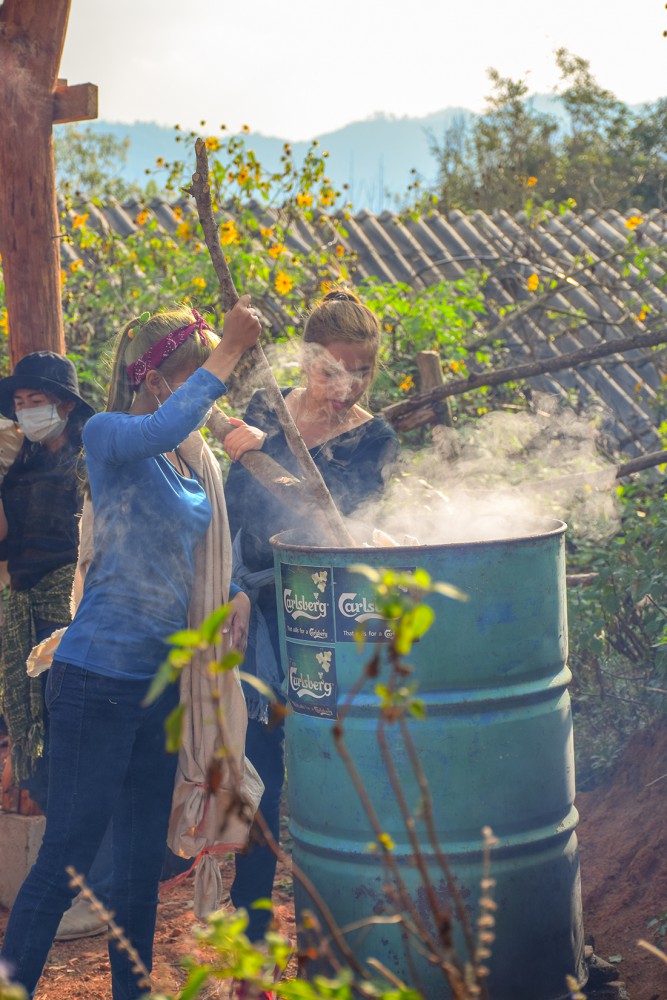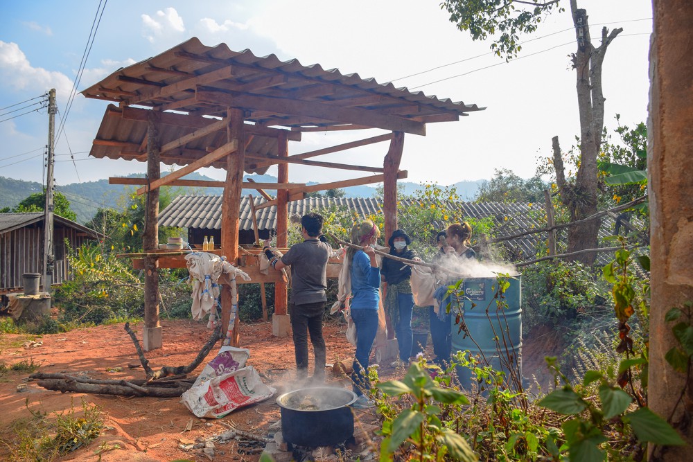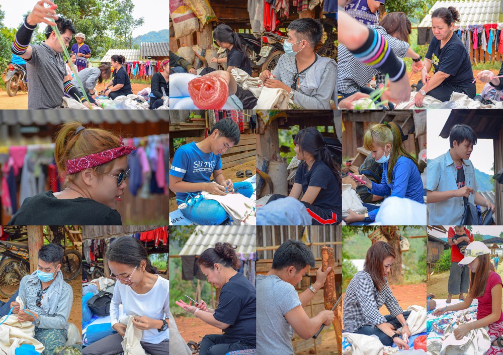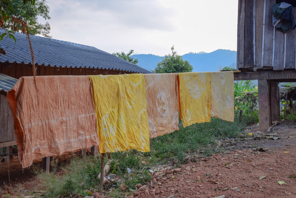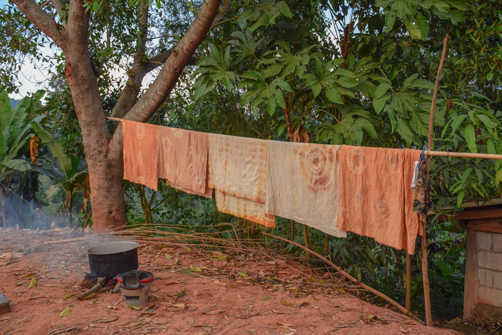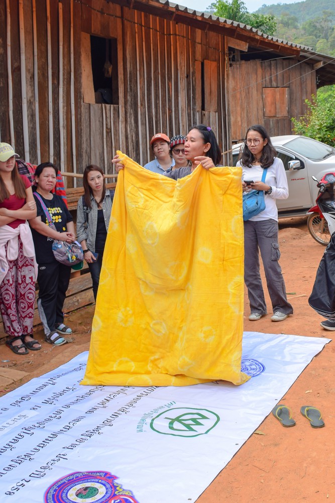 สังเกตุจากภาพนี้จะเห็นว่า ทุกคนไม่ได้มีผลงานแค่ชิ้นเดียวแน่ๆ 5555 แต่ก็สนุกดีครับ ผมนี่ยิ้มทั้งวันเลย เป็นหมู่บ้านเล็กๆ ที่โอบล้อมด้วยภูเขา ธรรมชาติ จริงๆ วันนี้แดดก็ดี ฟ้าก็เปิด รอเวลาจนผ้าต้มเสร็จ เดินจน งง อะครับ ต้มหม้อไหนบ้างเพราะเราจะต้องช่วยเพื่อนๆด้วย ถึงเวลาแล้วครับ 5555 ต้องเอาผลงานขึ้นแล้ว แต่เชื่อไหมครับว่า แยกไม่ออกเลย ของใครเป็นของใคร เวล่าก็จวนเจียนใกล้มืดเข้ามา ทีนี้ละครับ งานรีบก็มาาาา