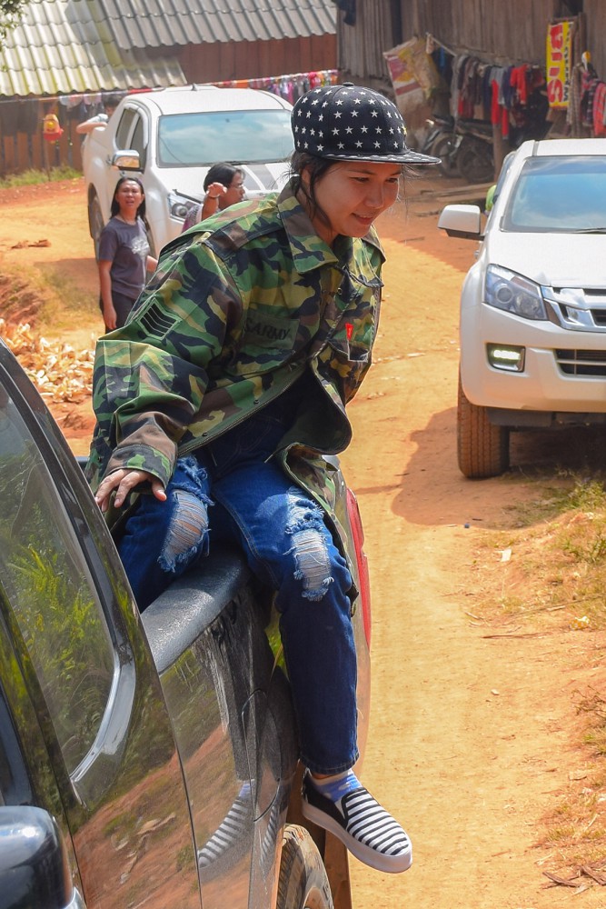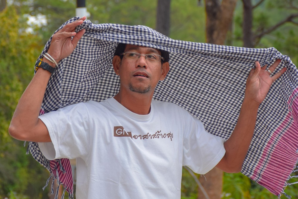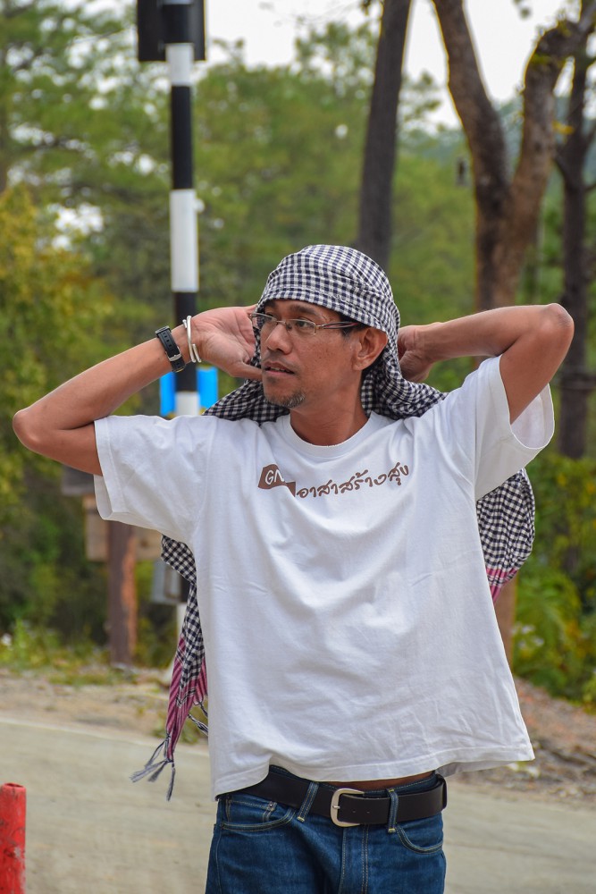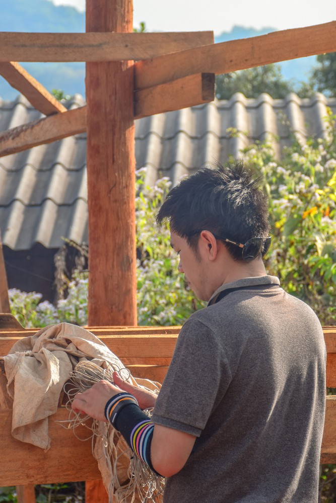 QC ตรวจเช็คการมัดอีกรอบครับ 5555 จริงๆแล้วถ้าเรามัดไม่แน่น ส่วนที่เรามัดไม่แน่นสีจะแทรกซึมเข้าไปซึ่งเวลาต้มเสร็จ จะไม่เกิดลายอะไรเลย ฉะนั้นต้องมัดให้แน่นครับ เราจึงต้องมี QC นั้นเอง QC ของเราคือพี่โอ๋ครับ พี่โอ๋คือพี่อีกท่านหนึ่งที่เป็นสมาชิกของกลุ่ม Give North ตั้งแต่แรกๆเลยครับ พี่โอ๋จะพยายามเดินช่วยทุกจุดเลยครับบ