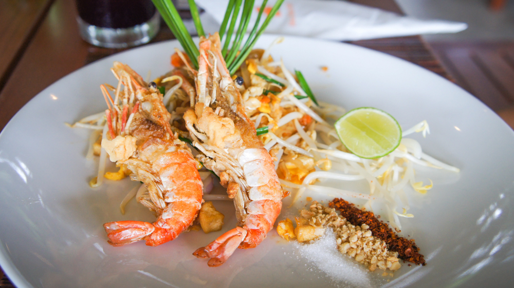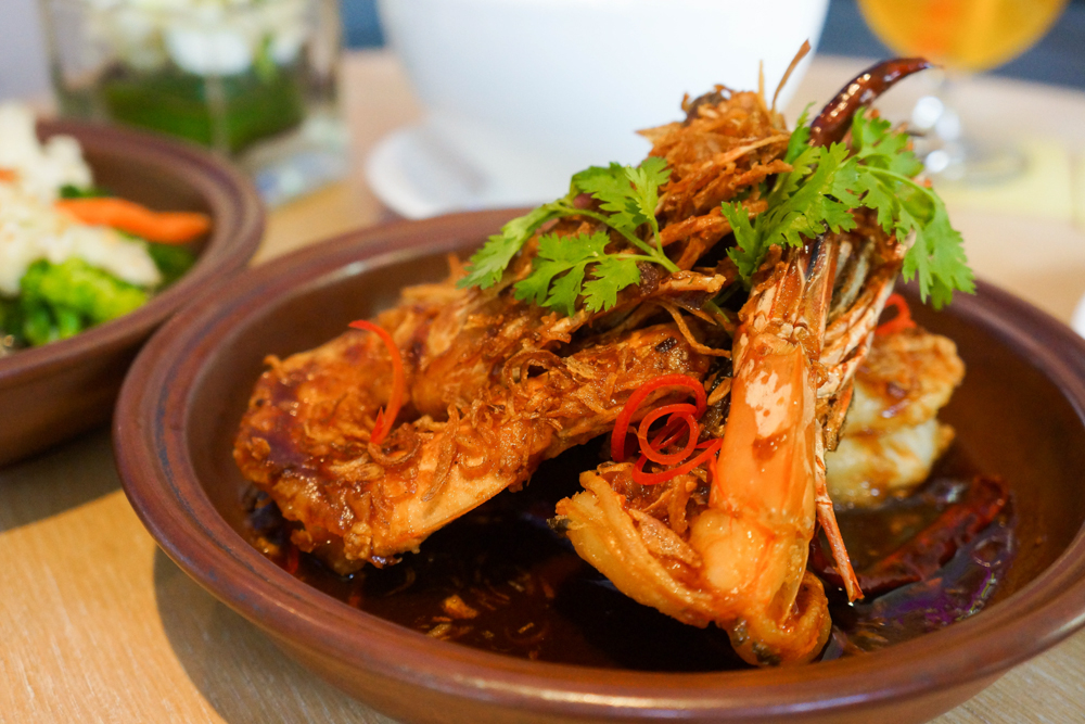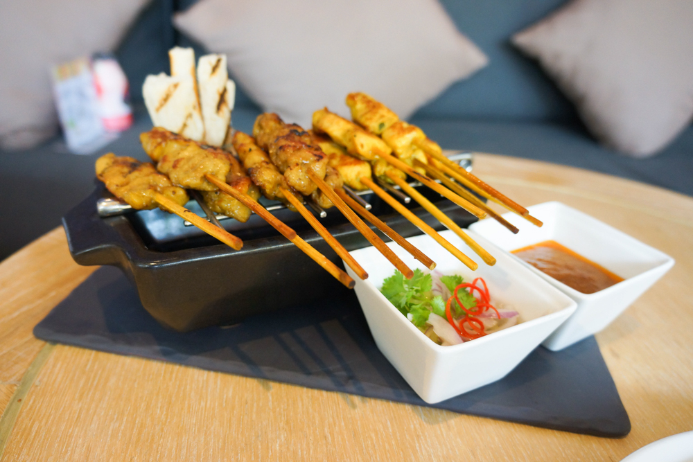 ไม่นานอาหารจานแรกก็มาเป็นหมูสะเต๊ะ ตามด้วยกุ้งผัดซอสมะขามและสุดท้ายเมนูไฮไลท์