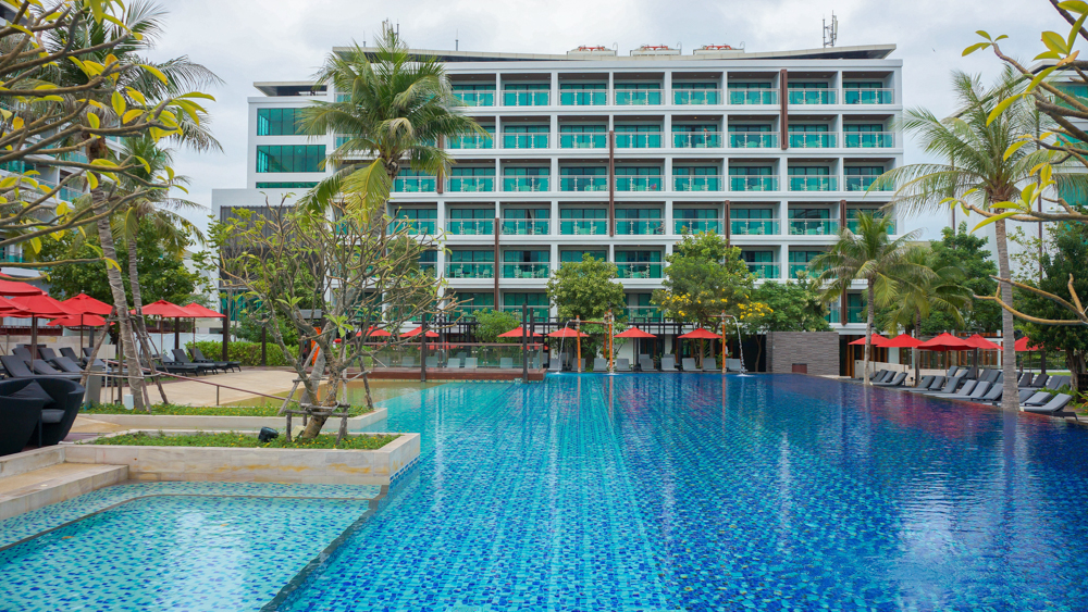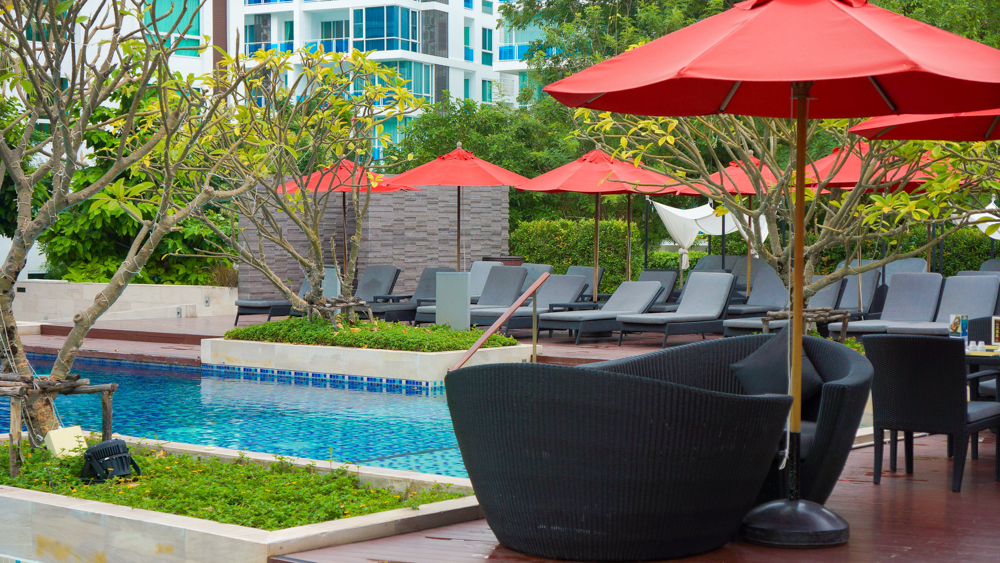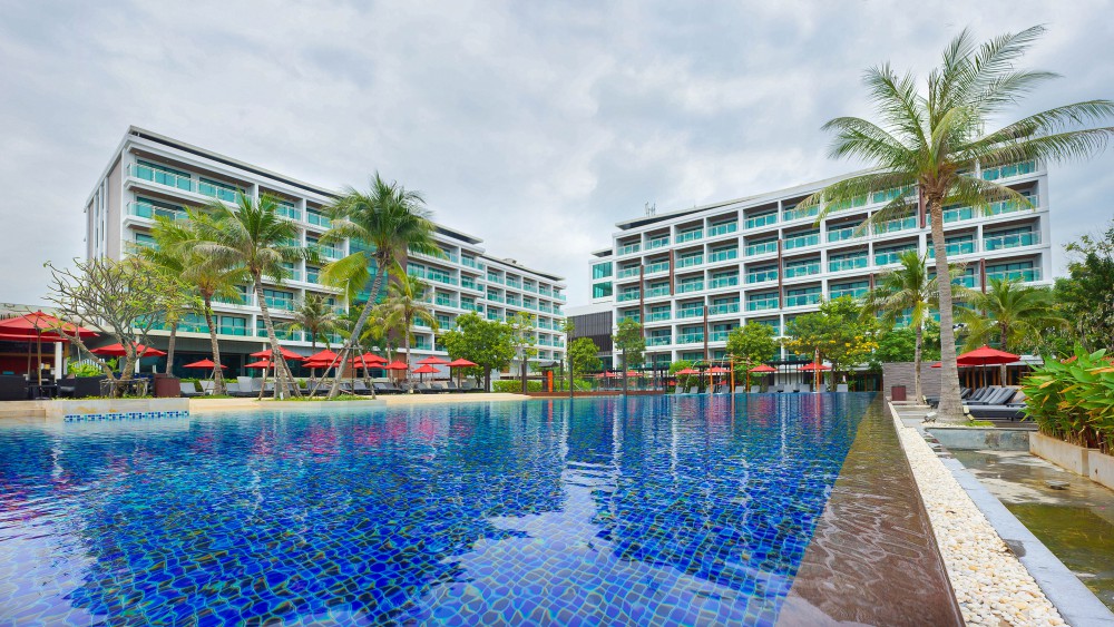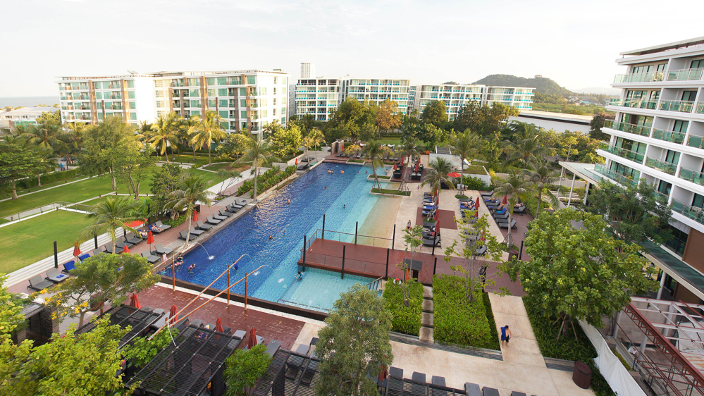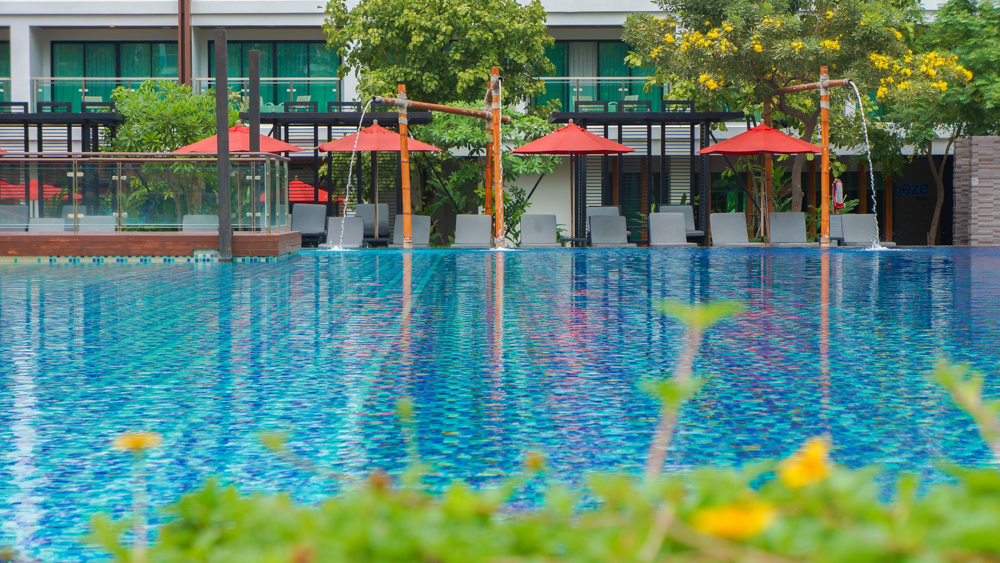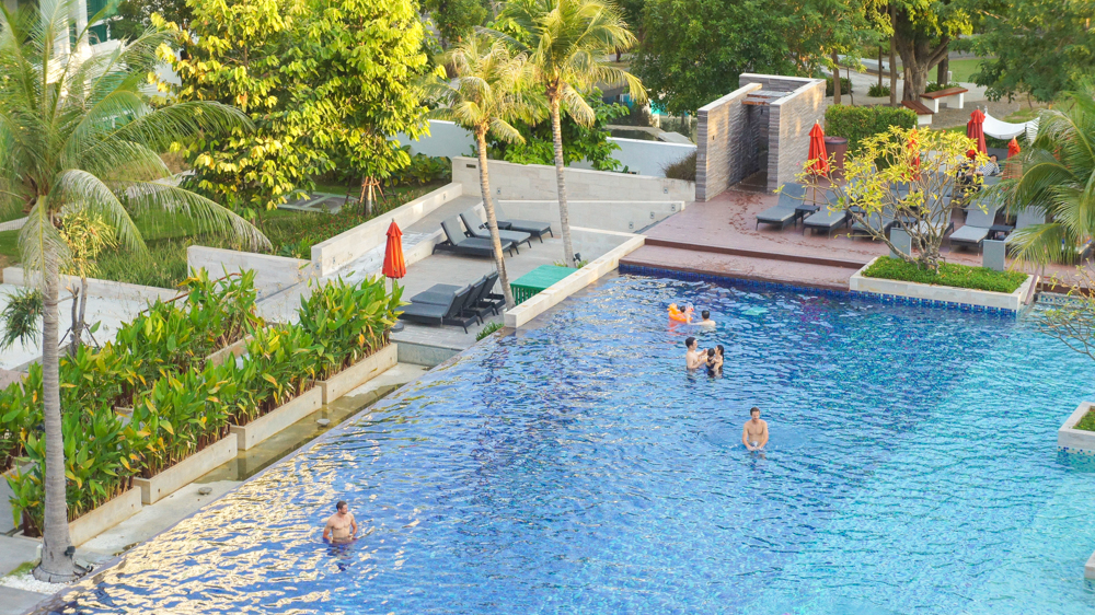 เพราะที่นี่ไม่ได้อยู่ติดทะเลสระว่ายน้ำของที่นี่จึงมีขยาดใหญ่และถูกออกแบบให้มีลักษณะลาดเอียงคล้ายๆชายหาด