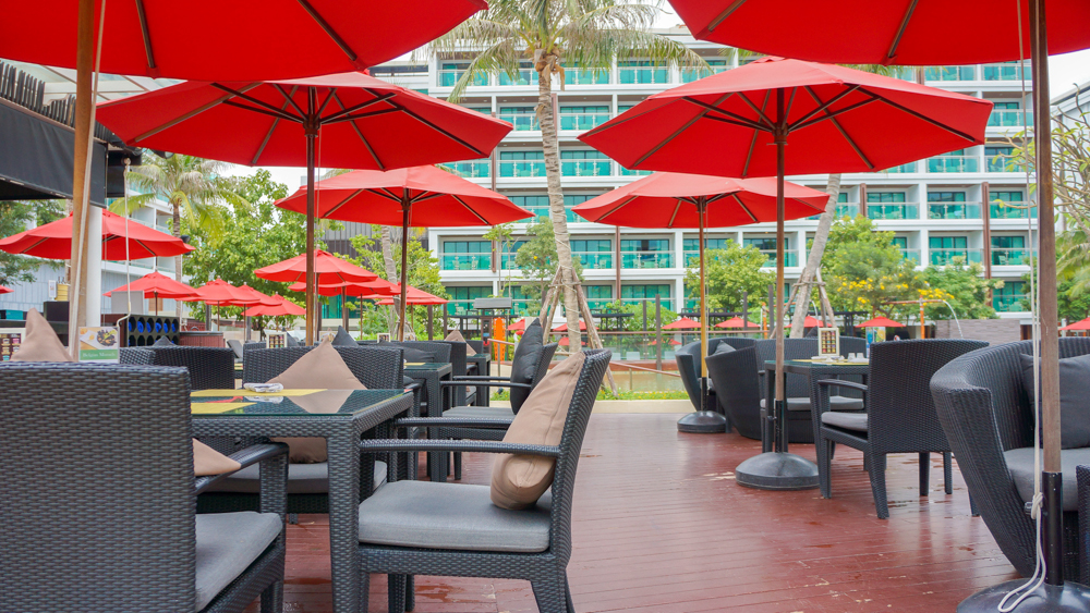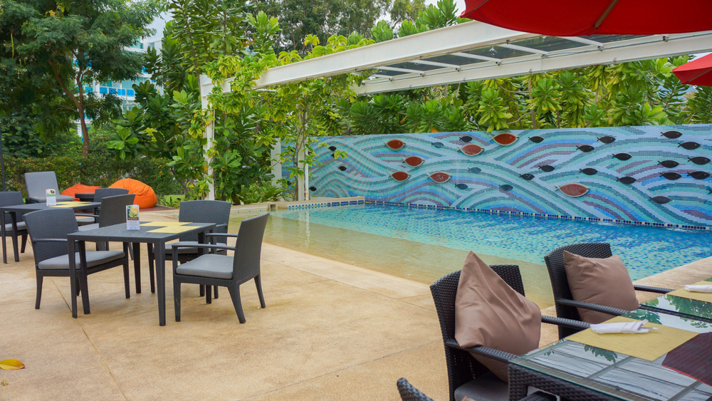 มีที่นั่งทั้งโซนด้านในและด้านนอกใกล้ๆกับสระว่ายน้ำ