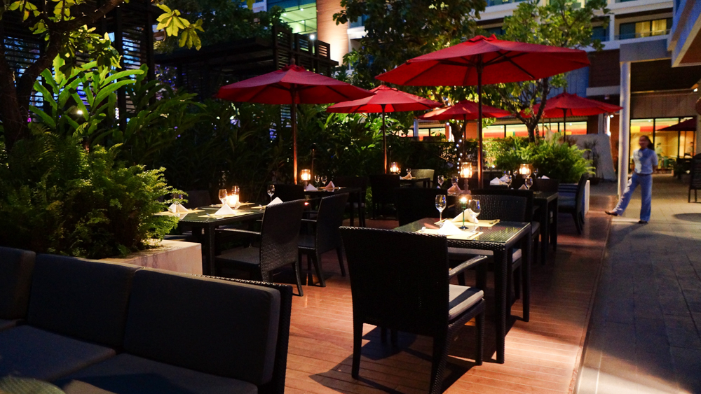 มื้อเย็นวันนี้เราทานที่รีฟ เดลี่ แอนด์ ไวน์ เลาจน์ ก็เลยไม่ขึ้นห้องแล้วนั่งรอเวลาอาหารเย็นที่ริมสระว่ายน้ำของโรงแรม