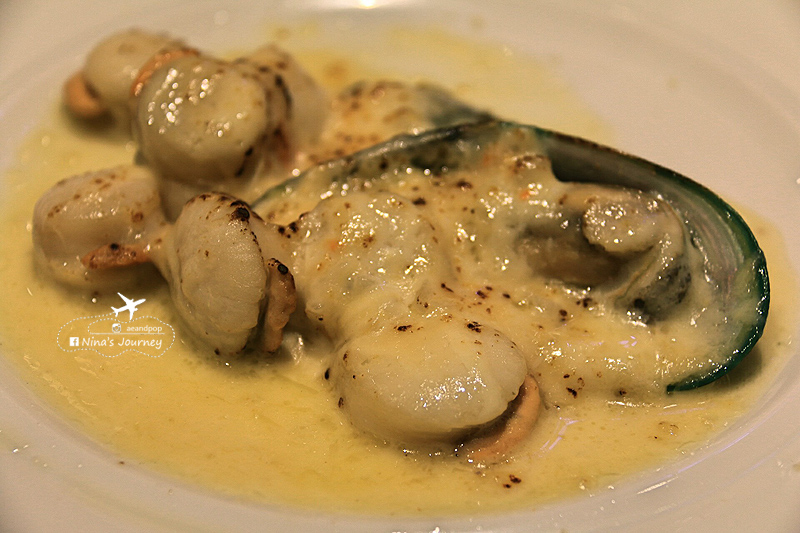 ชอบชีสเป็นทุนเดิม เลยขอให้เชฟปรุงอาหารจานพิเศษให้ (อย่างทึ่เกริ่นไว้ เราสามารถสร้างสรรค์ได้ตามความต้องการ ถ้าทำได้ เชฟเขาจัดให้ค่ะ !!!) … เลยสั่งหอยอบชีสมา 1 จาน เชฟจัดมาให้ทั้งหอยเชลล์และหอยแมลงภู่ ทานตอนกำลังร้อนๆชีสเยิ้มๆ … หูยยย ช่างดีงามซะจริงๆ