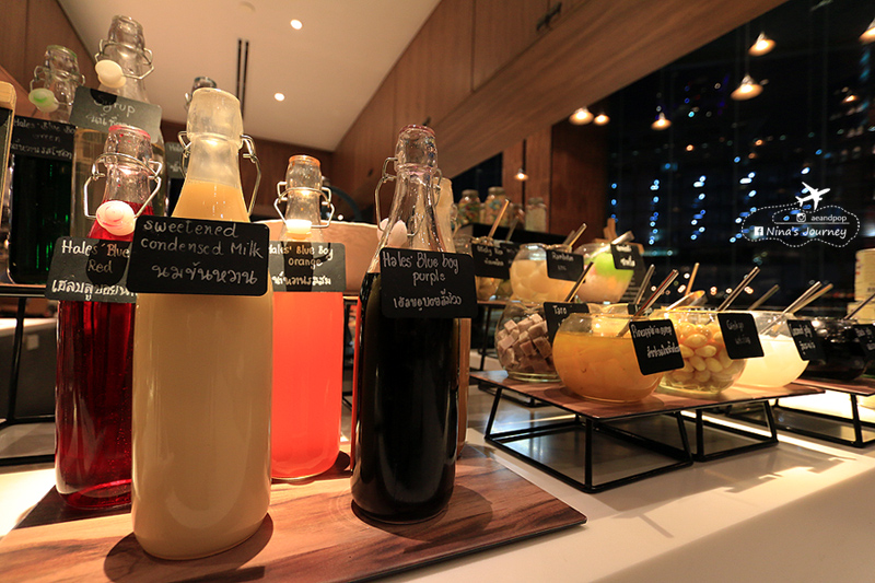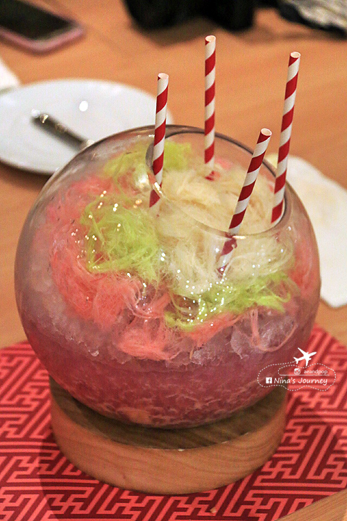 ต้องบอกก่อนว่าเครื่องดื่มต่างๆ จะไม่ได้รวมอยู่ในราคาอาหารบุฟเฟ่ต์นะคะ สั่งเพิ่มต่างหากตามความต้องการ ... ยกตัวอย่างเมนูเครื่องดื่มนี้มีชื่อว่า “Our Sweet Earth” ถ้าสั่งสำหรับคนเดียวก็แก้วละ 250++บาท แต่ถ้าสั่งชุดใหญ่โหลละ 500++บาท สีสันหวานแหวว ดูเหมือนขนมหวานมากกว่าจะเป็นค๊อกเทลด้วยสายไหมแบบไทยๆที่ใส่เพิ่มสีสันลงไป (อันนี้ขอไปถ่ายภาพโต๊ะข้างๆมา ไม่ได้ลองชิมเอง)