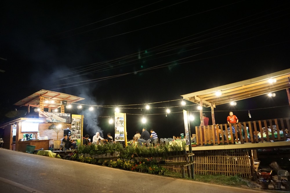 ดึกๆเราออกมาเดินเล่น ด้านหน้าที่พักมีร้านหมูกระทะอีกเจ้าหนึ่ง จะมานั่งทานนั่งผิงไฟก็ได้บรรยากาศดีค่ะ