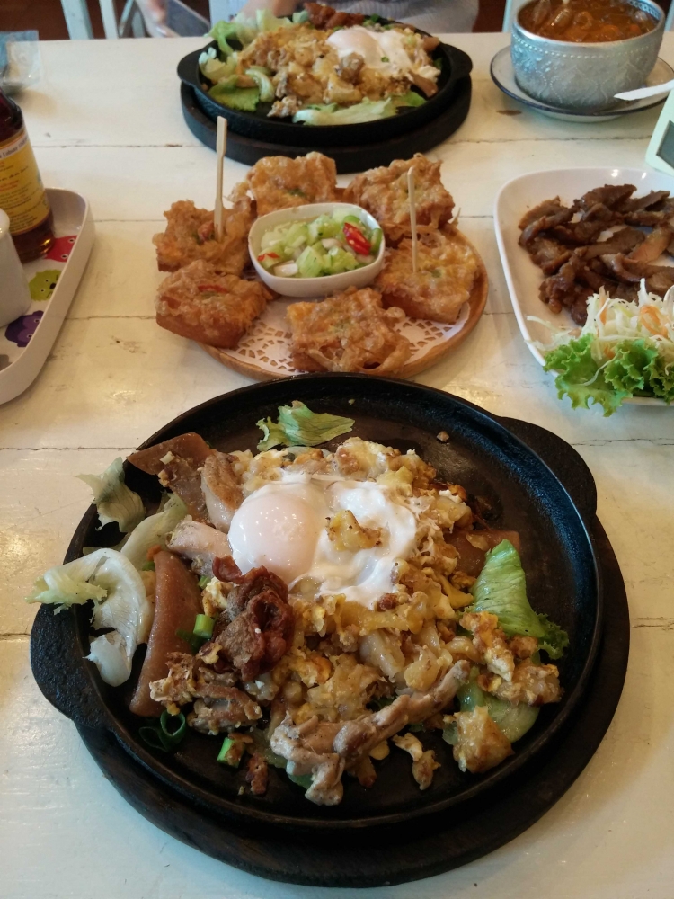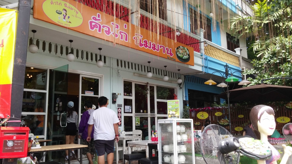 หลังออกจากวัดพันเตา ท้องก็ร้องจ๊อกๆส่งสัญญาณว่าเวลาใกล้เที่ยง ให้รีบหาร้านข้าวประทังความหิวก่อนออกตะลุยเชียงใหม่กันต่อ งานนี้เจ้าถิ่นซึ่งก็คือแฟนผมพาไปฝากท้องที่ร้านคั่วไก่นิมมาน ถึงร้านจะชื่อคั่วไก่ แต่ก็มีอาหารให้เลือกหลากลาย อาทิ ปีกไก่ทอดน้ำปลา, ก๋วยเตี๋ยวคั่วไก่อบไข่กระทะร้อน, ยำเกี๊ยวกรอบกุ้งสด, ข้าวซอยเนื้อน่องลายตุ๋น, หมูสะเต๊ะโบราณ เป็นต้น