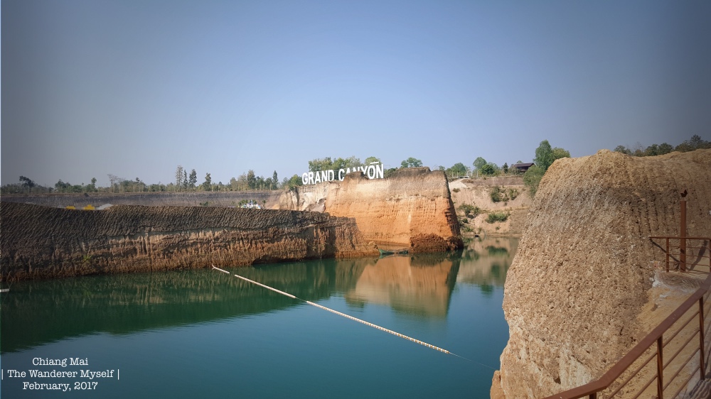 >  หลังจากที่ได้กราบไหว้ขอพระ หลวงพ่อทันใจและสิ่งศักดิ์สิทธิ์ในวัดพระธาตุดอยคำเสร็จแล้ว  เราก็เดินทางต่อไปที่ "แกรนด์แคนยอน" อ.หางดง กัน  > แกรนด์แคนยอนที่นี่ เกิดจากที่บริเวณนี้เมื่อ 10 ปีที่แล้ว มีการขุดหน้าดินขาย มีความลึกถึง 15-20 เมตร จนกลายเป็นบ่อดินขนาด 30 ไร่ เมื่อหมดประโยชน์จึงปล่อยให้น้ำท่วมขัง เวลาผ่านไปหลายปีกลายเป็นแอ่งน้ำขนาดใหญ่ สีเขียวมรกต  เจ้าของบ่อจึงเปลี่ยนบ่อดินให้เป็นสถานที่ท่องเที่ยว  เพิ่มเครื่องเล่นทำคล้ายๆ สวนน้ำ และดูแลรักษาความปลอดภัย มีเสื้อชูชีพ มีร้านกาแฟ – อาหารและห้องน้ำ ไว้อำนวยความสะดวกให้กับนักท่องเที่ยว ค่าเข้าชมคนละ 50 บาท