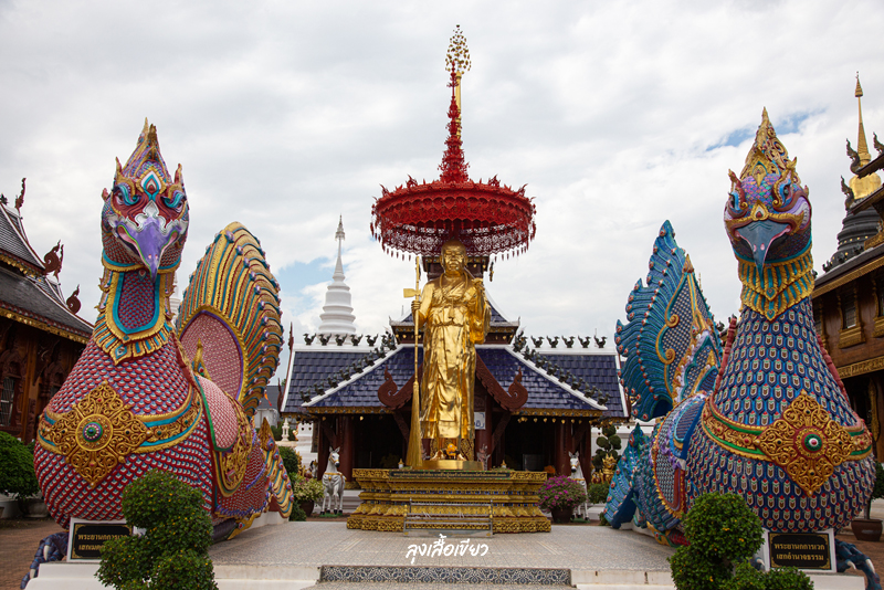 รูปหล่อพระครูบาเจ้าเทือง นาถสีโล องค์สีทองอร่าม ผู้สร้างวัดบ้านเด่น ด้านหลังรูปหล่อเป็นมณฑปที่ประดิษฐานพระเศรษฐีนวโกฏิ