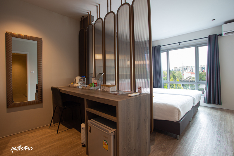ติดกับเตียงนอน เป็นมุมสำหรับแต่งตัวและมุมนั่งทำงานหรือทานอาหารก็ได้ พร้อมตู้เย็นและมินิบาร์โดยมีฉากกั้นที่มีดีไซน์โค้งมน ตามคอนเซปของโรงแรมครับ