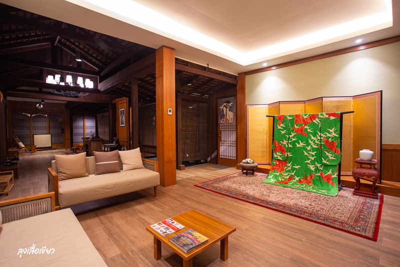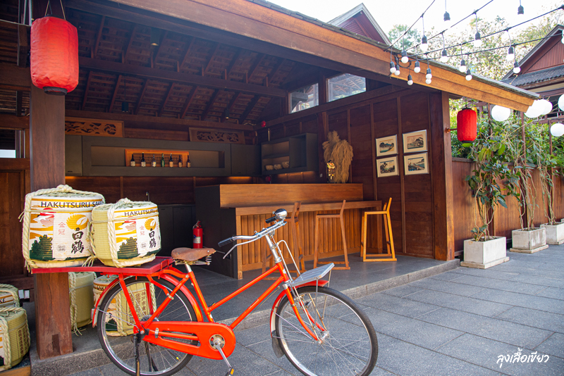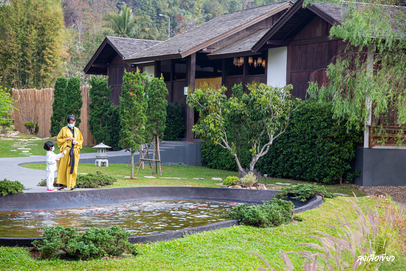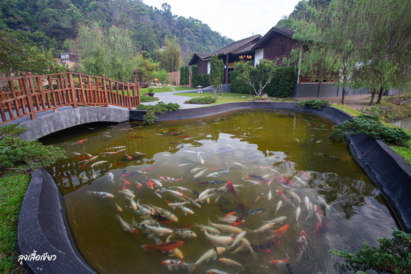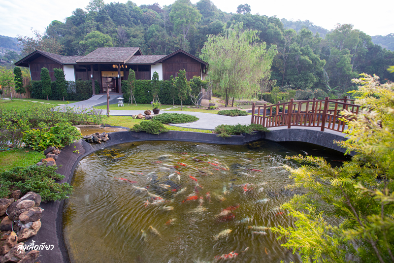 สำหรับอาคารไม้หลังนี้เป็นโรงออนเซ็น และยังมีปลาคราฟฝูงใหญ่ให้ชมกันเพลินๆ ด้วย