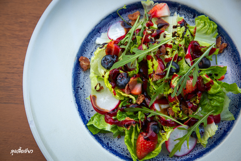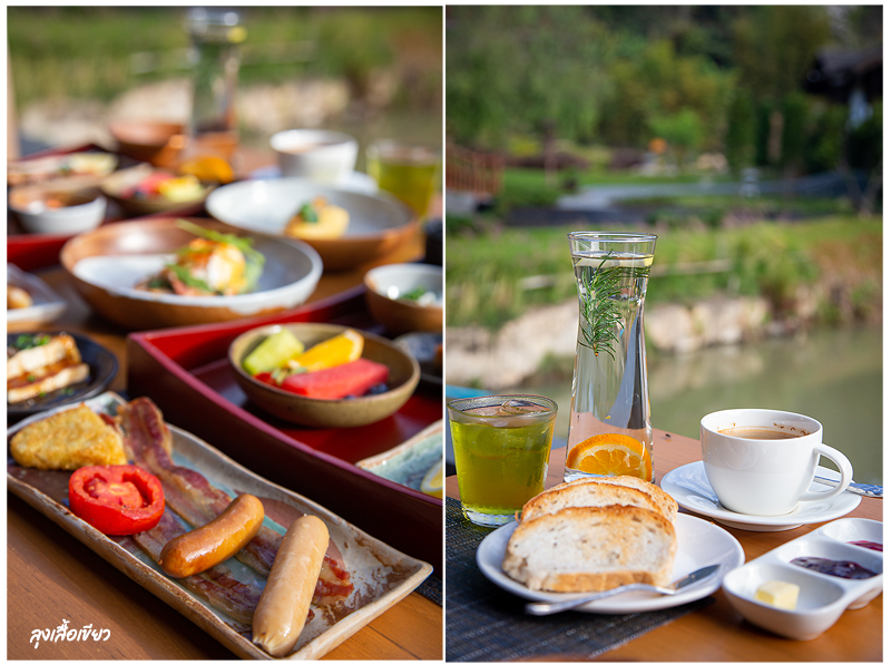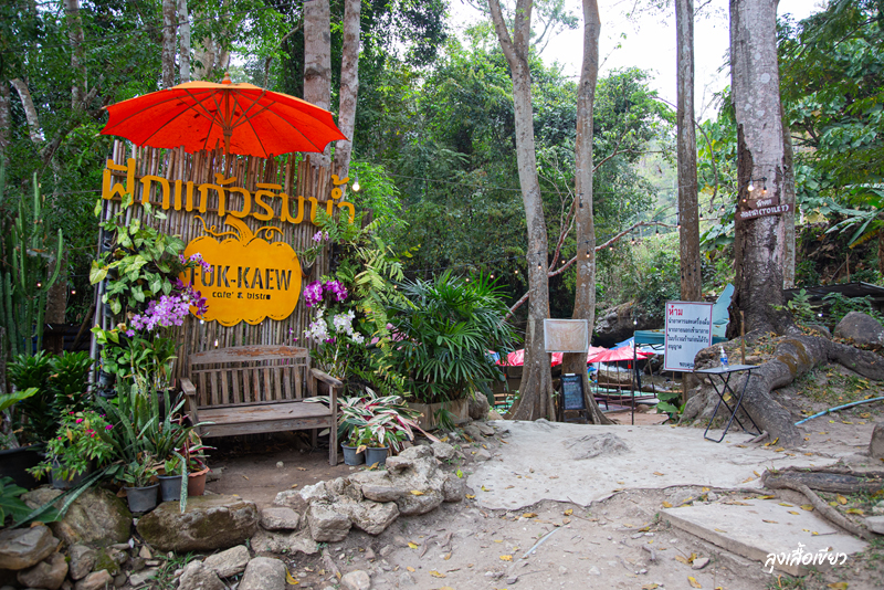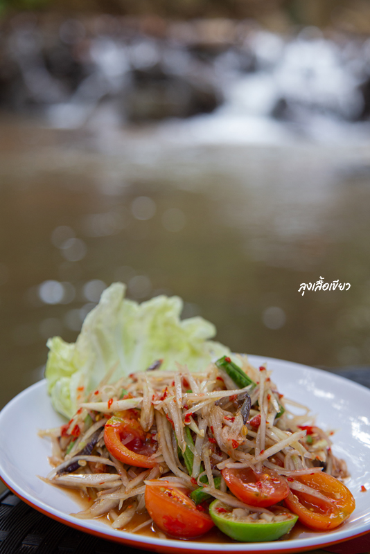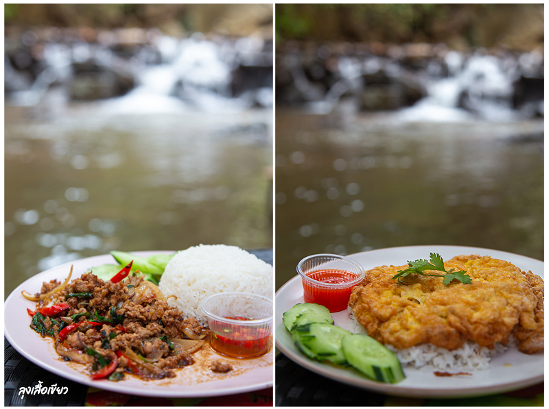 ร้านฟักแก้วริมน้ำเป็นร้านอาหารเล็กๆ ริมน้ำ ผมเลือกที่จะไปนั่งที่ริมลำธารเลยครับ โต๊ะที่นั่งจะคล้ายๆ เป็นแคร่ไม้ไผ่ ตั้งอยู่บนผิวน้ำ มื้อนี้ได้อาหารจานด่วนแบบง่ายๆ เพราะตอนที่ผมเดินลงมานั่ง ได้กลิ่นไข่เจียวที่โต๊ะอื่นสั่งมาเตะจมูกเข้าอย่างจัง เลยจัดไปครับ เพิ่มเติมด้วยข้าวผัดกระเพาและส้มตำปูปลาร้าแซบๆ ครับ