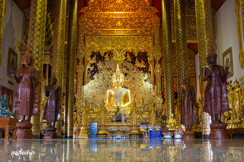 ถัดจากหอพระธรรม เป็นที่ตั้งของพระวิหารมาต๋าม ภายในประดิษฐาน พระแก้วเกล้าเจ้าบุญเรือง ซึ่งเป็นพระประธานที่มีสีเหลืองทองอร่าม มีพระพุทธรูปแกะสลักจากไม้ ประดิษฐานเรียงรายตามเสาพระอุโบสถ ด้านหลังพระวิหารเป็นที่ประดิษฐานของ 12 พระธาตุประจำปีเกิด ที่จำลองมาจากพระธาตุประจำปีเกิดทั่วประเทศครับ