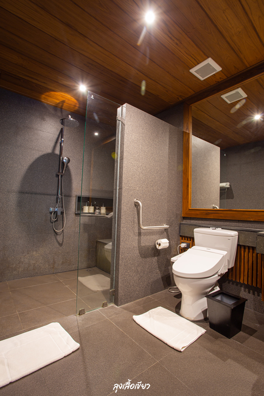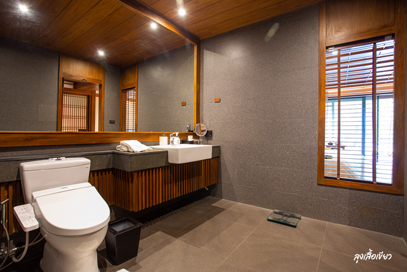 สำหรับห้องน้ำ กว้างขวางเอาเรื่องเลยครับ โถสุขภัณฑ์ใช้ระบบแบบญี่ปุ่น น้องพนักงานรีบออกตัวเรื่องกระดาษชำระว่า ที่นี่ใช้กระดาษชำระแบบย่อยสลายได้ เนื้อกระดาษเลยอาจจะดูบาง หากนำกระดาษชำระใส่ลงไปในขวดน้ำแล้วเขย่า กระดาษชำระจะย่อยสลายจนหมด ที่น้องเขาต้องรีบออกตัวก่อน เพราะกลัวว่าผมจะเข้าใจผิดเหมือนกับแขกท่านอื่นๆ ที่เคยคอมเพลนว่าห้องพักราคาออกจะแพง แต่ทำไมใช้กระดาษชำระแบบบาง สำหรับอุปกรณ์แปรงสีฟัน ยาสีฟัน หากลืมพกติดตัวมา สามารถโทรไปขอได้ครับ