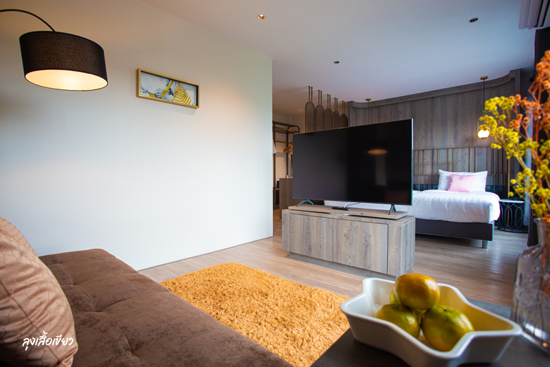 บริเวณปลายเตียง เป็นมุมพักผ่อน มีโซฟาขนาดใหญ่ พร้อมสมาร์ททีวีจอใหญ่เบิ้มเลยครับ