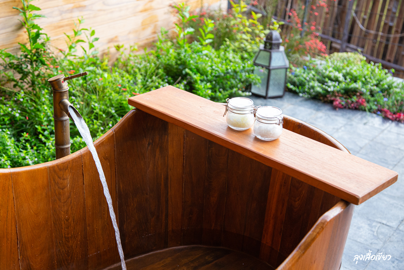 เมื่อครบเวลา ก็มาแช่ตัวในออนเซ็นน้ำเย็นในอ่างไม้ครับ