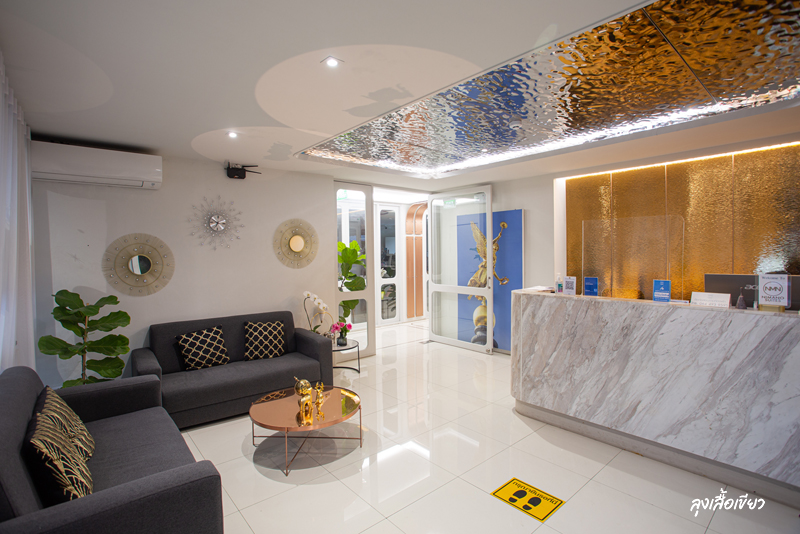 ลอบบี้ตกแต่งแบบเรียบแต่ดูหรู ในโทนสีขาวผสมผสานกับสีโรสโกลด์ มีการนำหินอ่อนเข้ามาเป็นส่วนประกอบร่วมด้วยครับ