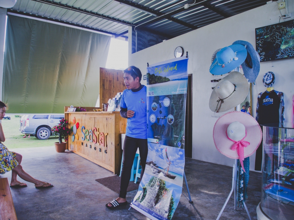 เมื่อถึงเวลาใกล้ออกเดินทาง ไกด์ประจำทริปซึ่งวันนี้เป็นไกด์ "ไผ่" จะทำหน้าที่ไกด์หลักดูแลลูกค้าบนเรือ ก็ต้องมีการบรีฟกิจกรรมต่างๆของโปรแกรมในวันนี้ แนะนำเกาะให้เรารู้จักกันก่อน แต่ละวันต้องขึ้นอยู่กับสภาพอากาศว่าจะได้ดำน้ำกี่จุด หลักๆแล้วจะดำน้ำกันสองจุดนะ ต้องไปลุ้นกันหน้างานว่าคลื่นเป็นอย่างไร