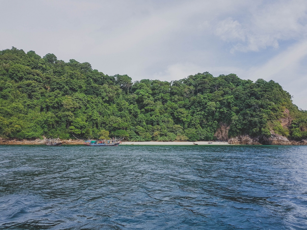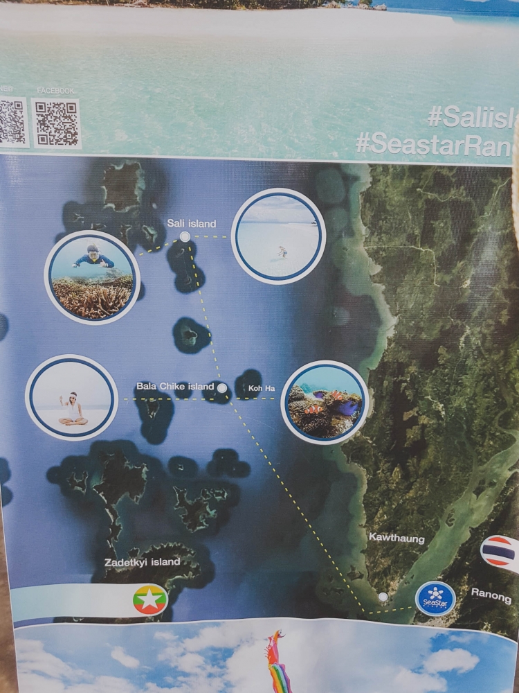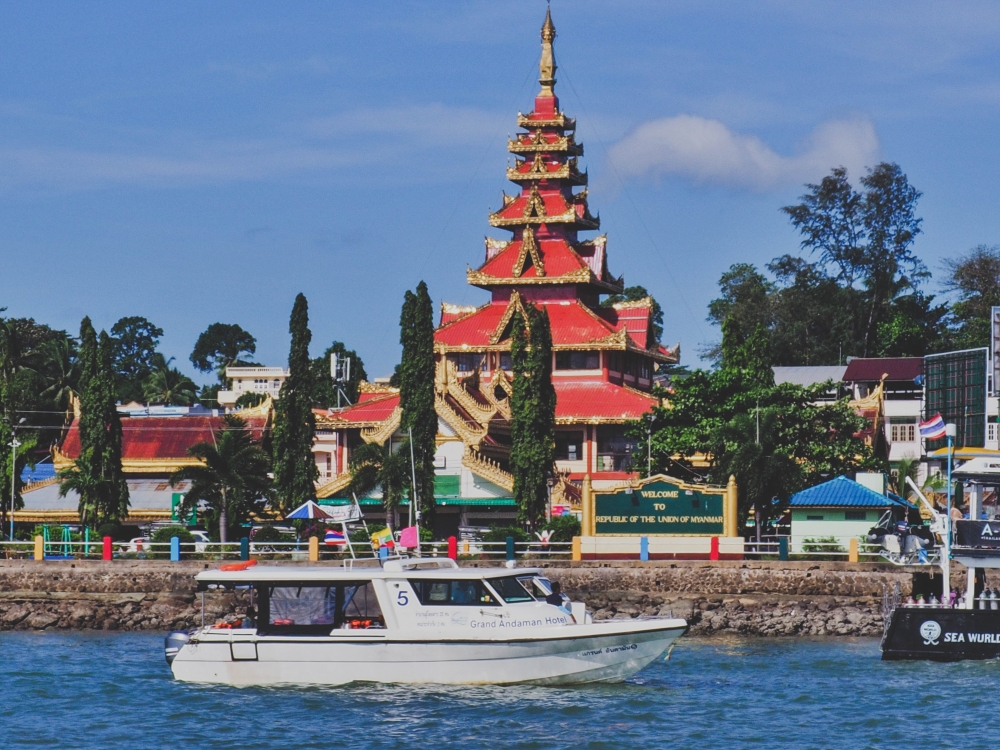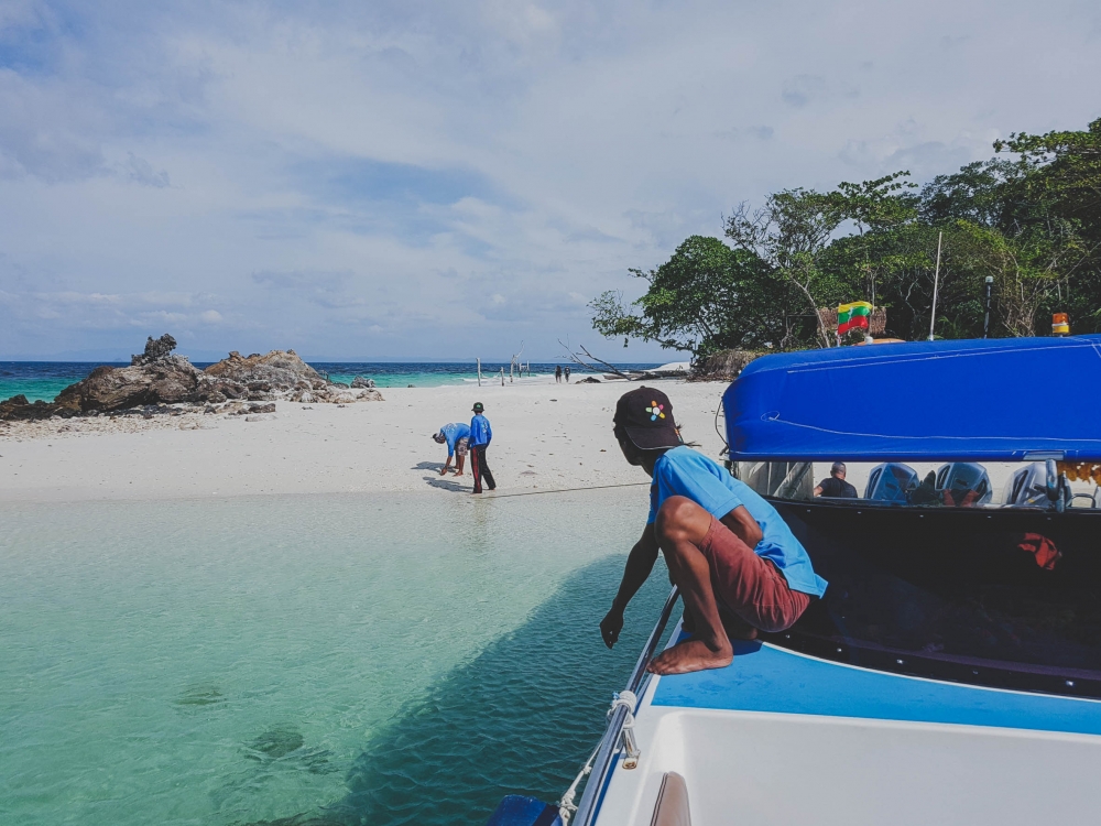 ออกจากท่าเรือแกรนด์อันดามันไม่ถึง 5 นาที ก็มาถึงเกาะสอง ประเทศพม่าแล้ว มาจอดเพื่อส่งเอกสารผ่านแดนต่อเจ้าหน้าที่ฝั่งนี้และรับนักท่องเที่ยวพร้อมไกด์พม่า เพราะทริปเกาะพม่าจะต้องมีไกด์ประเทศเขาไปด้วย