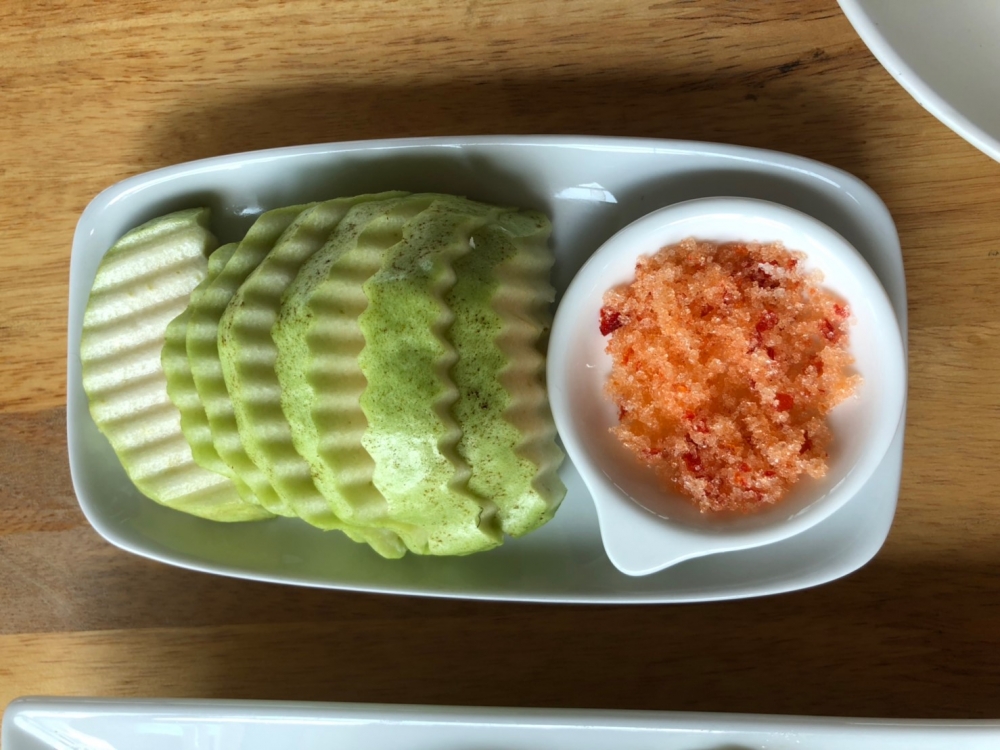 ฝรั่งพริกเกลือ เป็นผลไม้ที่ทางร้านเสริ์ฟให้กับลูกค้าฟรี ฝรั่ง หวาน อร่อยดีค่ะ