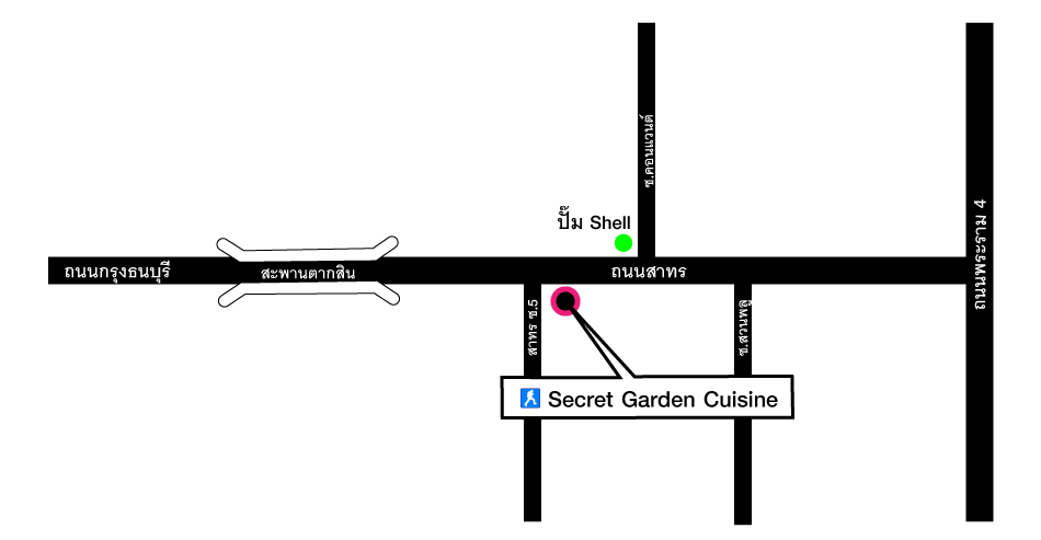 จากถนนสาทรใต้มุ่งหน้าไปทางสะพานตากสิน จนถึงซอยสาทรใต้5 จะเห็นร้าน Secret Garden อยู่ทางด้านซ้ายมือตรงข้ามกับซอยคอนแวนต์