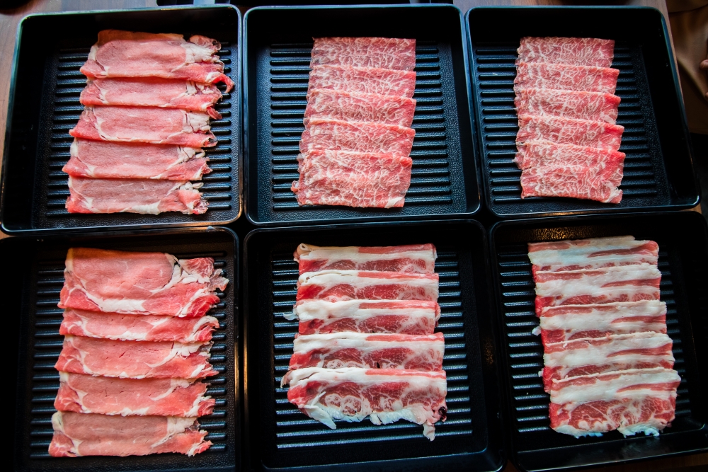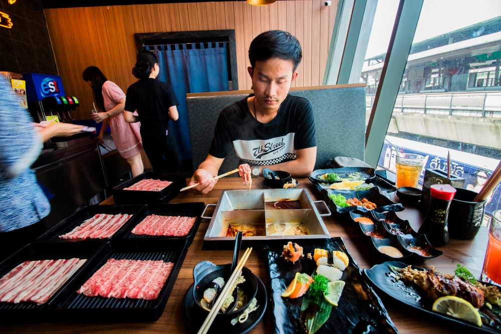 เนื้อ US และ Australian หมูคุโรบุตะ และไก่ ซีฟู้ด หมึก หอย และกุ้ง น้ำซุบที่เลือกได้ถึง 4แซลมอนกับบุฟเฟ่ต์อิ่มไม่อั้น