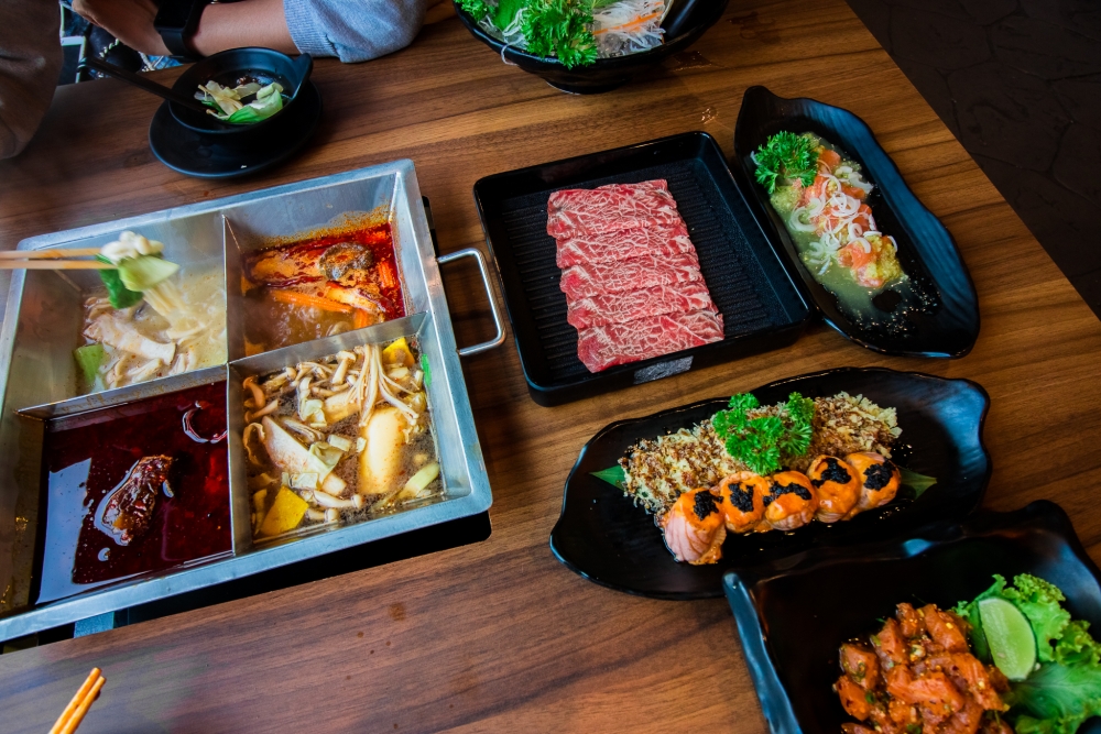 เนื้อชั้นดีระดับพรีเมี่ยม หมูคุโรบุตะ ไก่ และซูชิหลากหลายหน้า Volcano Roll น้ำซุบเลือกได้ 2 สี ของหวาน ชานมไข่มุก พุดดิ้งไข่มุกแครมบรูว์เล ไอศกรีม และเจลลี่