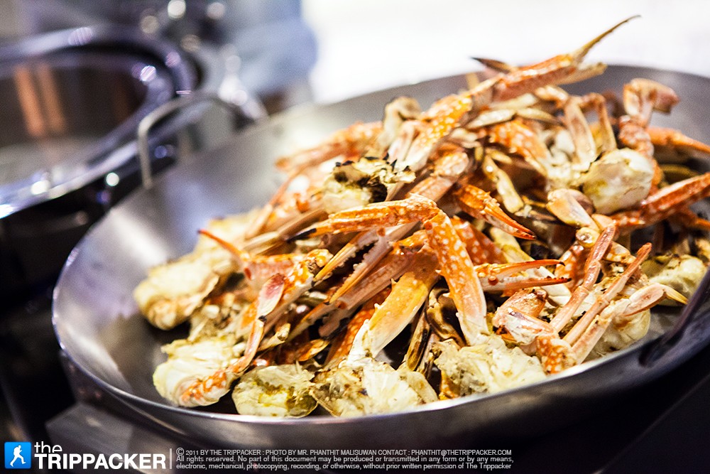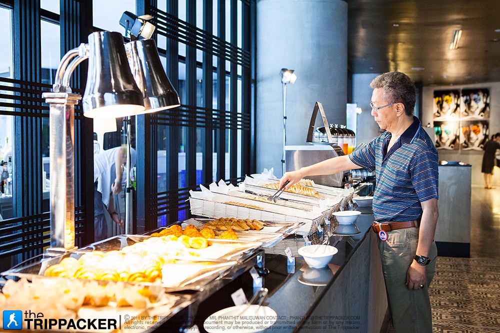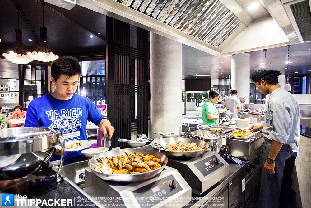 ทีนี้ก็ได้เวลามาตะลุยชมและชิมอาหารในไลน์บุฟเฟ่ต์กันบ้าง ซึ่งมีให้เลือกไม่มากไม่น้อย เริ่มกันตั้งแต่อาหารเบาๆ เรียกน้ำย่อยทั้งสลัดผักสดๆ ปลารมควันหลายสไตล์ โคลด์คัทและชีสนานาชาติ รวมถึงซุปร้อนๆ ถัดมาจะเป็นไลน์เมนูอาหารหลักหนักท้องนานาชาติ ไม่ว่าจะเป็นอาหารไทย อินเดีย จีน ญี่ปุ่น และยุโรป เช่น ปลาอบชีส มันฝรั่งอบ เนื้อแกะ สตูว์เนื้อ แฮม ไก่เทอริยากิ ซูชิ ซาซิมิ ติ่มซำ ผัดผัก ผัดเผ็ด แกงแขกเสิร์ฟพร้อมแป้งนาน และเมนูอื่นๆ อีกมาก รวมถึงซีฟู้ดบาร์บีคิวทั้ง กุ้ง กั้ง ปู ปลา ปลาหมึก แถมด้วยสเต๊ะไก่ ที่ย่างร้อนๆ ให้เห็นกันตรงหน้า แค่เดินเลือกตักอย่างละนิดอย่างละหน่อยก็เต็มจานแล้ว เลยต้องเดินออกมาตักกันอีกหลายรอบ แต่ก็ยังชิมได้ไม่ครบอยู่ดีเพราะต้องเผื่อท้องไว้สำหรับของหวานด้วย ที่ไลน์ของหวานก็มีสารพัดขนมหวานให้เลือกอีกเพียบทั้ง ขนมปัง เพสทรีนานาชนิด ขนมเค้กชิ้นเล็กๆ ที่ทำให้เราชิมได้หลายรส มูส ครีมบลูเล่ แพนนาคอตต้า ช๊อคโกแลตฟองดูว์ ขนมไทย ผลไม้ และไอศครีมที่เราสามารถเลือกผสมท๊อปปิ้งได้ตามใจชอบ นี่ขนาดเป็นบุฟเฟ่ต์ในวันธรรมดา อาหารยังเยอะขนาดนี้ ถ้าใครเลือกมาใช้บริการในคืนวันเสาร์แล้วล่ะก็ เชื่อเถอะว่าอาหารจะละลานตากว่านี้อีก เพราะทุกคืนวันเสาร์จะมีเมนูบาร์บีคิวเพิ่มเติมเข้ามาอีกเยอะแยะมากมาย รวมถึงหมูหันทั้งตัวที่เริ่มย่างกันตั้งแต่เย็น เห็นแล้วทั้งต่อมน้ำลายและน้ำย่อยแย่งกันทำงานน่าดู ถ้าใครอดใจไหวก็ลองดูครับ
