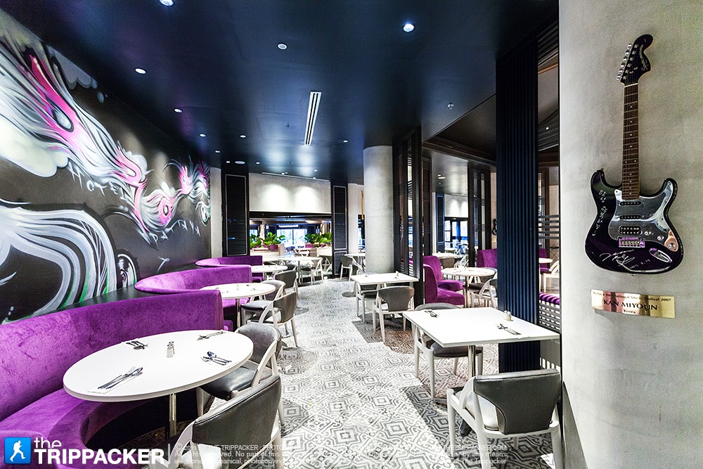 ภายในห้องอาหาร Starz Diner นั้นถูกตกแต่งอย่างเรียบง่ายด้วยโทนสีขาว-ดำ แทรกด้วยโซฟาสีม่วงที่มาช่วยเติมความสดใสให้ห้องอาหารนี้ไม่เข้มขรึมจนเกินไป ตามผนังถูกประดับด้วยกีตาร์พร้อมลายเซ็นต์ของนักดนตรีชื่อดังมากมาย คงคอนเซ็ปต์เอาใจร็อคเกอร์แบบเต็มๆ โดยปกติแล้วบุฟเฟ่ต์มื้อค่ำของที่นี่จะมีให้เลือก 2 แบบ นั่นก็คือ “Eat to the beat” และ“Eat to the new beat” ซึ่งแบบแรกจะเป็นบุฟเฟ่ต์รวม Free Flow เครื่องดื่มทั้งซอฟดริ้ง ค็อลเทล ไวน์ และเบียร์ เสิร์ฟเต็มที่ตลอดมื้อ เรียกว่าถ้าไม่กลัวเดินไม่ตรงตอนกลับห้องก็จัดเต็มกันได้เลย ส่วนแบบหลังนั้นจัดกันแบบหอมปากหอมคอ ซึ่งเราสามารถเลือกเครื่องดื่มแก้วโปรดได้ 1 แก้ว ยกเว้นไวน์ ใครถูกใจสไตล์ไหนก็เลือกกันได้ตามใจชอบเลย